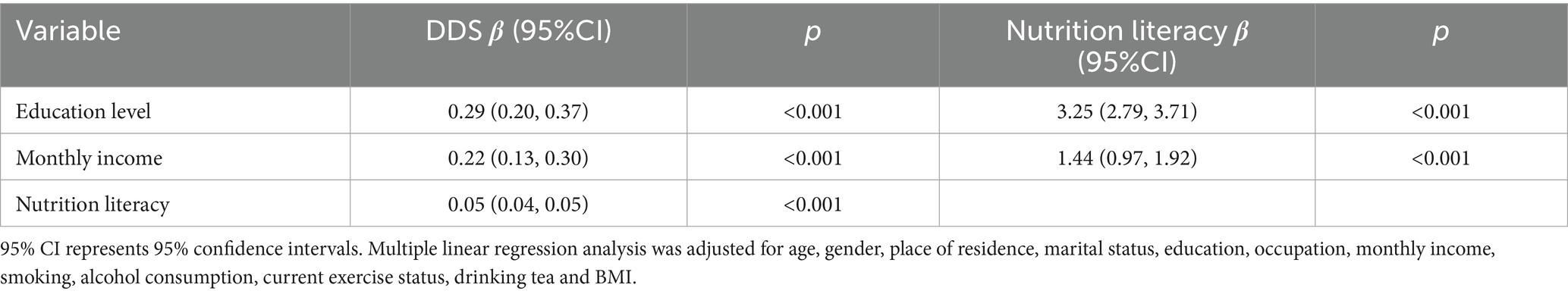 Table 2 presents NL scores by socioeconomic status, showing that respondents with higher education levels and greater monthly income had significantly higher NL scores (p < 0.05). As indicated in Table 3, after adjusting for potential confounders (age, gender, place of residence, marital status, education, occupation, monthly income, smoking, alcohol consumption, current exercise status, tea drinking, and BMI), both components of SES showed significant positive associations with DDS and nutrition literacy. Specifically, higher education level was associated with greater DDS and higher nutrition literacy. Similarly, higher monthly income was linked to increased DDS and improved nutrition literacy. Additionally, nutrition literacy itself was positively associated with DDS.