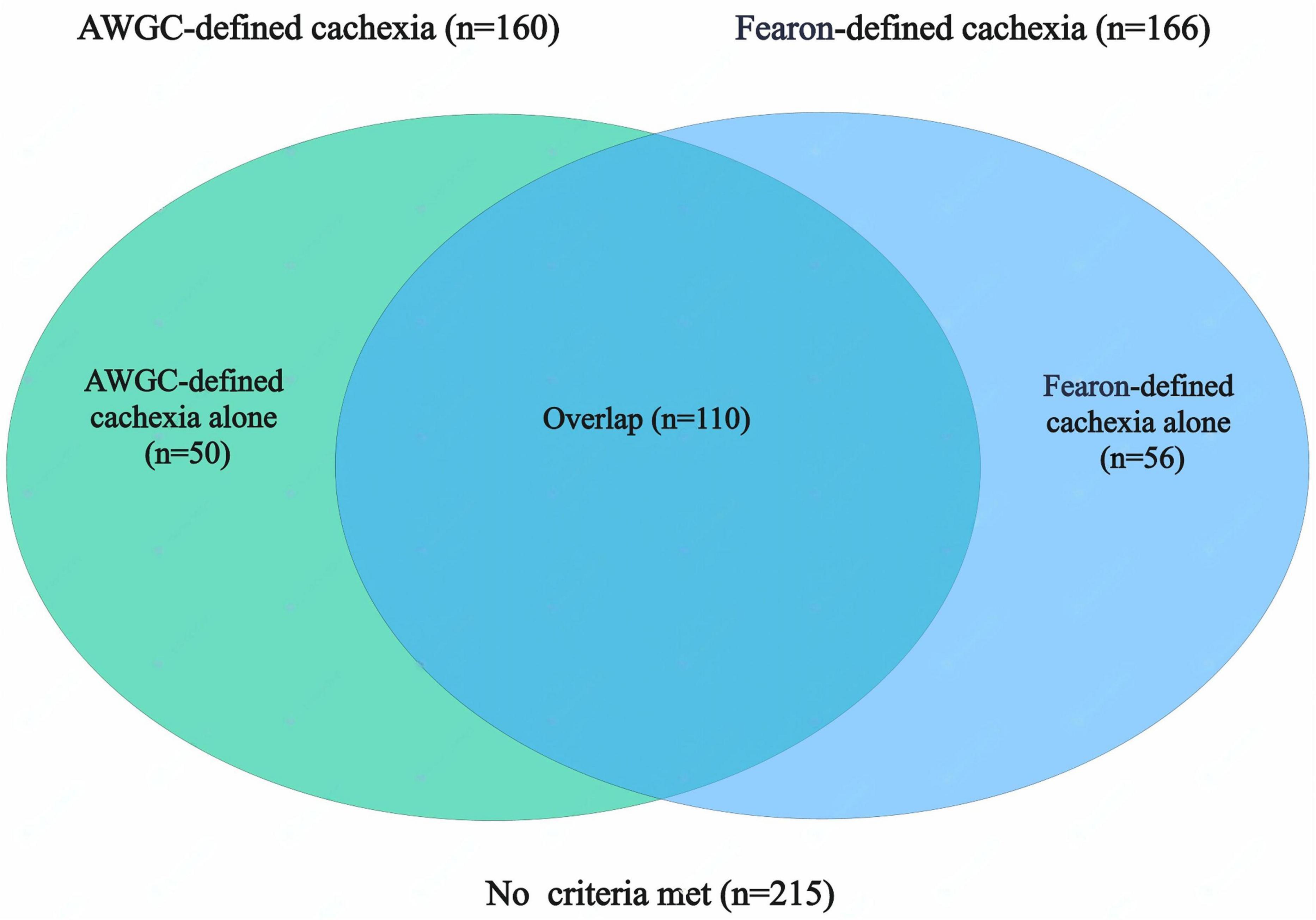 Figure 1. Co-occurrence of cachexia identified by Fearon’s and AWGC criteria in patients with gastric cancer (GC). AWGC, Asian Working Group for Cachexia.