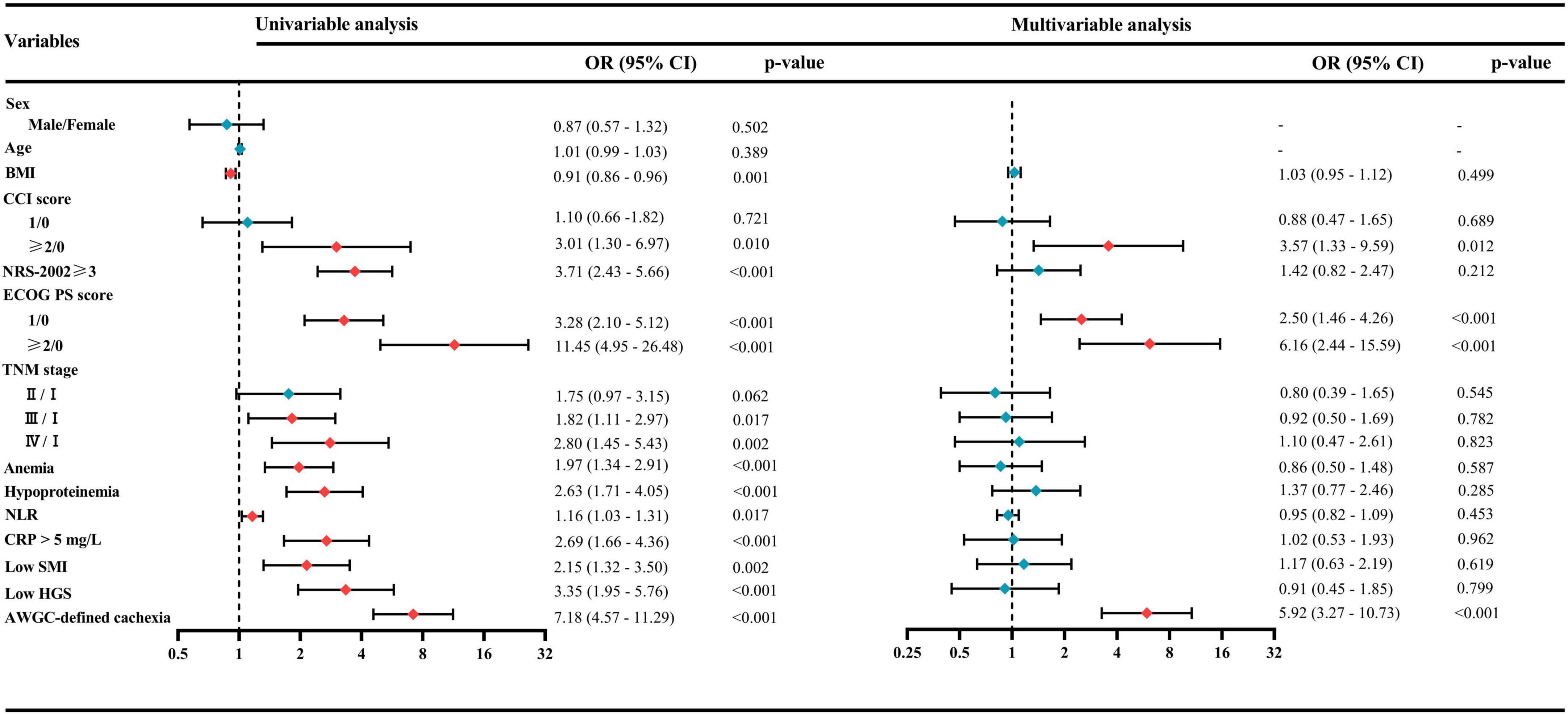Figure 2. Univariate and multivariate logistic regression analyses for identifying risk factors associated with poor health-related quality of life (HRQoL). AWGC, Asian Working Group for Cachexia; BMI, body mass index; CCI, Charlson Comorbidity Index; CRP, C-reactive protein; ECOG PS, Eastern Cooperative Oncology Group performance status; HGS, handgrip strength; NLR, neutrophil-to-lymphocyte ratio; NRS-2002, Nutritional Risk Screening-2002; SMI, skeletal muscle index; TNM, tumor–node–metastasis.