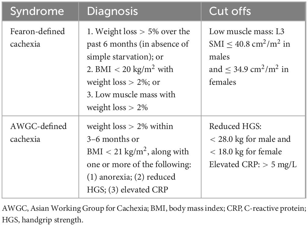 9. Sakaguchi T, Maeda K, Takeuchi T, Mizuno A, Kato R, Ishida Y, et al. Validity of the diagnostic criteria from the Asian working group for Cachexia in advanced cancer. J Cachexia Sarcopenia Muscle. (2024) 15:370–9. doi: 10.1002/jcsm.13408