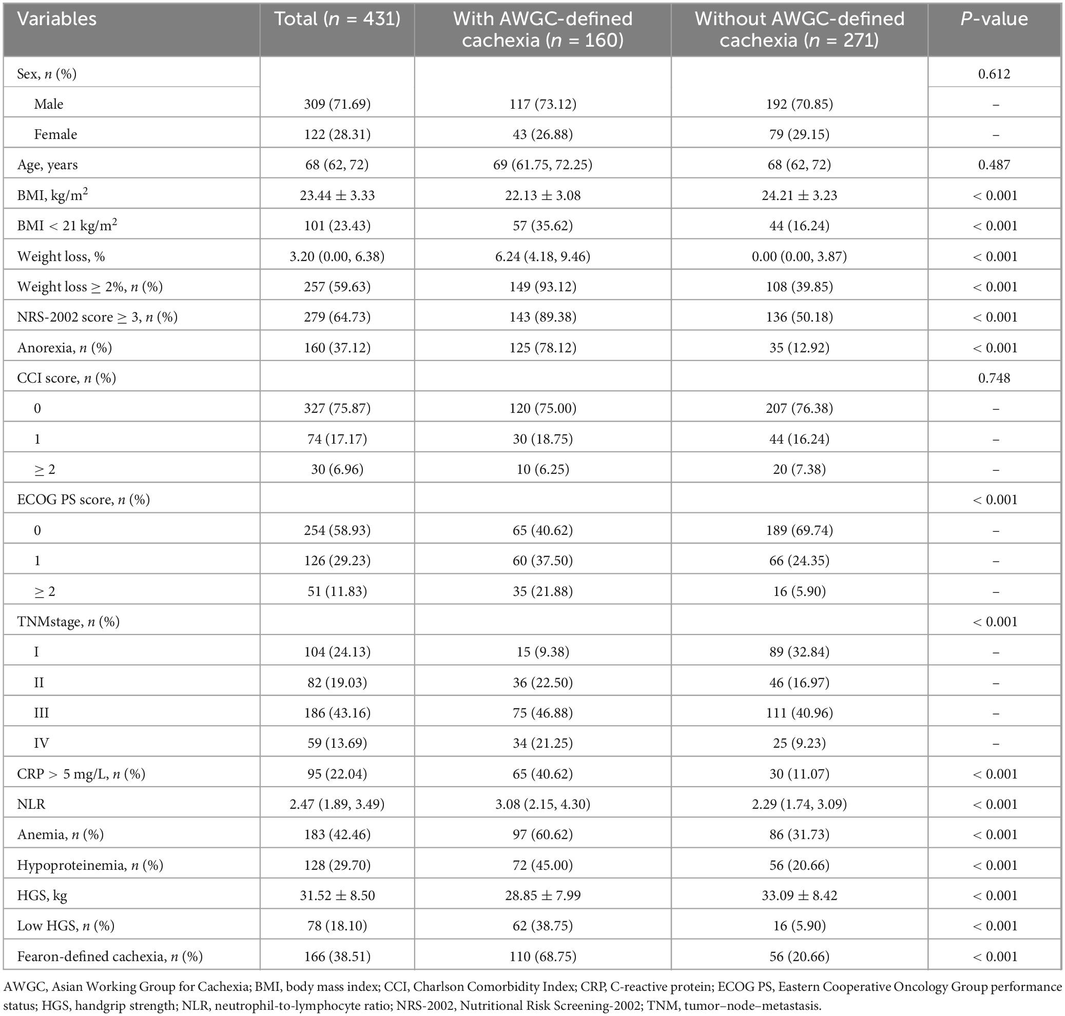 As shown in Table 2, patients with AWGC-defined cachexia had lower BMI (22.13 ± 3.08 vs. 24.21 ± 3.23; p < 0.001), higher weight loss proportion [6.24 (IQR 4.18–9.46) vs. 0.00 (0.00–3.87); p < 0.001], and higher NLR [3.08 (2.15–4.30) vs. 2.29 (1.74–3.09); p < 0.001]. No difference was observed in sex distribution (p = 0.612) or CCI score (p = 0.748). Patients with AWGC-defined cachexia had higher proportions of hypoalbuminemia (45.00% vs. 20.66%; p < 0.001), CRP > 5 mg/L (40.62% vs. 11.07%; p < 0.001), anemia (60.62% vs. 31.73%; p < 0.001), low grip strength (38.75% vs. 5.90%; p < 0.001), and anorexia (78.12% vs. 12.92%; p < 0.001). Differences were also observed in ECOG PS (p < 0.001) and TNM stage (p < 0.001) between patients with and without AWGC-defined cachexia.