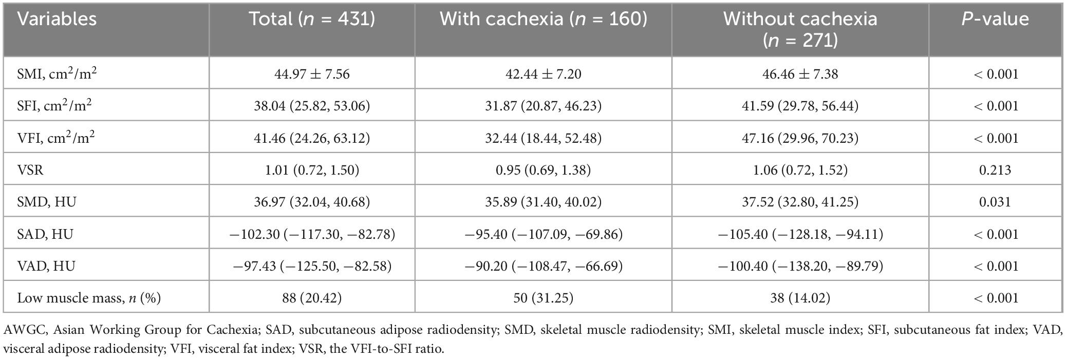 Cachexia is prevalent among patients with GC. This syndrome is characterized by the loss of body composition, specifically skeletal muscle and adipose tissue (5). It is mainly caused by diminished food intake and metabolic alterations, such as increased energy expenditure, heightened catabolism, and inflammatory responses (7). In this study, we conducted a comparative analysis of body composition differences between patients with cachexia and those without. Our findings revealed a significant reduction in both muscle mass and fat mass among patients suffering from cachexia. Furthermore, there was a notable decrease in skeletal muscle density, while fat density exhibited a significant increase. It is essential to highlight that reduced radiodensity values in skeletal muscle or increased radiodensity values in adipose tissue are regarded as pathological. Lower skeletal muscle radiodensity can reflect intramuscular fat infiltration, reduced physical function, and metabolic dysregulation (19). On the other hand, higher fat tissue radiodensity may suggest increased lipid consumption and a stronger inflammatory response, which has been shown to be associated with increased mortality in cancer patients (20, 21). Thus, although the assessment of body composition is not explicitly included in the AWGC criteria for diagnosing cachexia, significant loss of body composition can be observed in patients with AWGC-defined cachexia.