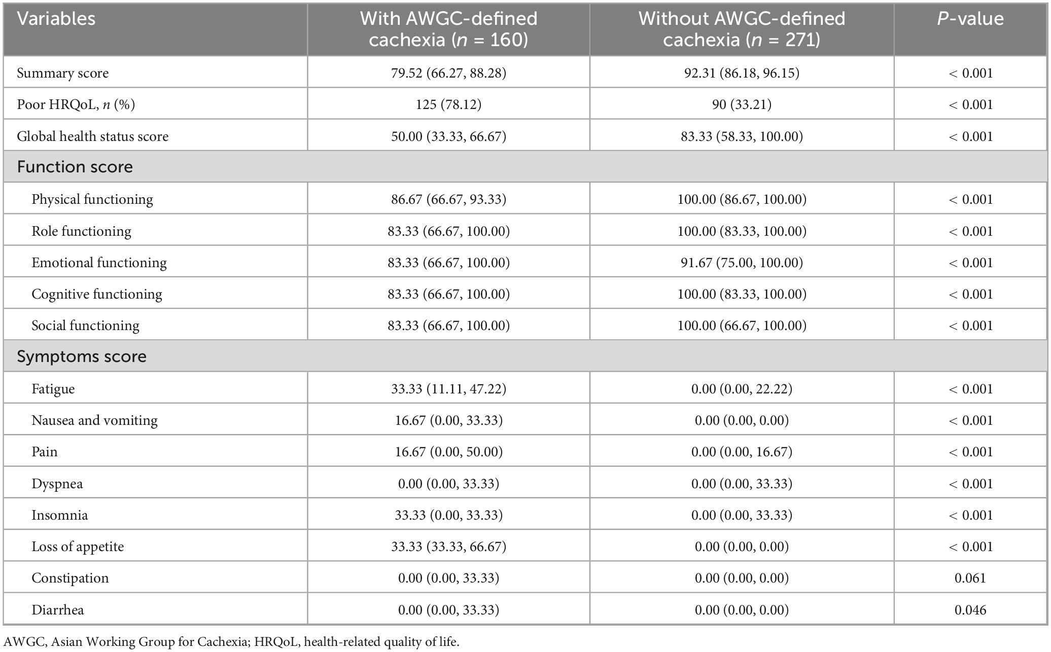 Statistical analyses were carried out using SPSS version 25.0 (IBM Corp, Armonk, NY, United States). Statistical significance was defined as p < 0.05. Categorical variables were expressed as numbers accompanied by percentages and analyzed through the chi-squared test. Continuous data were reported as either means with standard deviation (SD) or medians with inter-quartile range (IQR), determined through statistical assessments of normality (assessed using the Kolmogorov–Smirnov test). Subsequently, independent t-tests or Mann-Whitney U-tests were, respectively conducted for further analyses. To identify potential risk factors associated with poor HRQoL, univariate logistic regression analyses were first carried out. Subsequently, variables that demonstrated a p-value of less than 0.1 in the univariate analysis and exhibited no multicollinearity (with a Variance Inflation Factor below 10) were selected for the multivariate analysis. The Kappa coefficient (k) was employed to evaluate the agreement between cachexia defined by the AWGC criteria and the Fearon’s criteria.