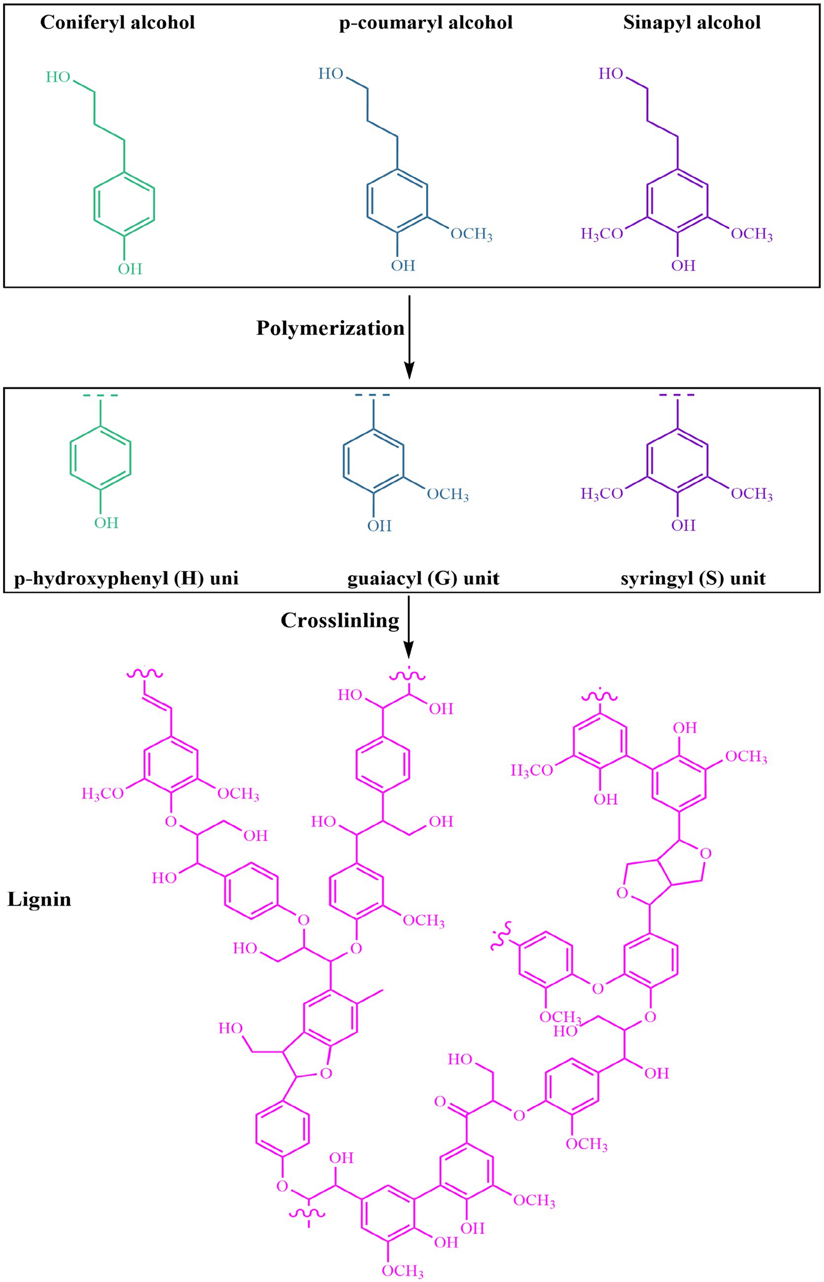 Figure 1. Schematic representation of lignin biosynthesis from monolignol precursors. The three main monolignols, p-coumaryl alcohol, coniferyl alcohol, and sinapyl alcohol, polymerize via radical coupling to form the structural units of lignin: p-hydroxyphenyl (H), guaiacyl (G), and syringyl (S) units, respectively. These units are then crosslinked into a complex and highly branched lignin macromolecule.