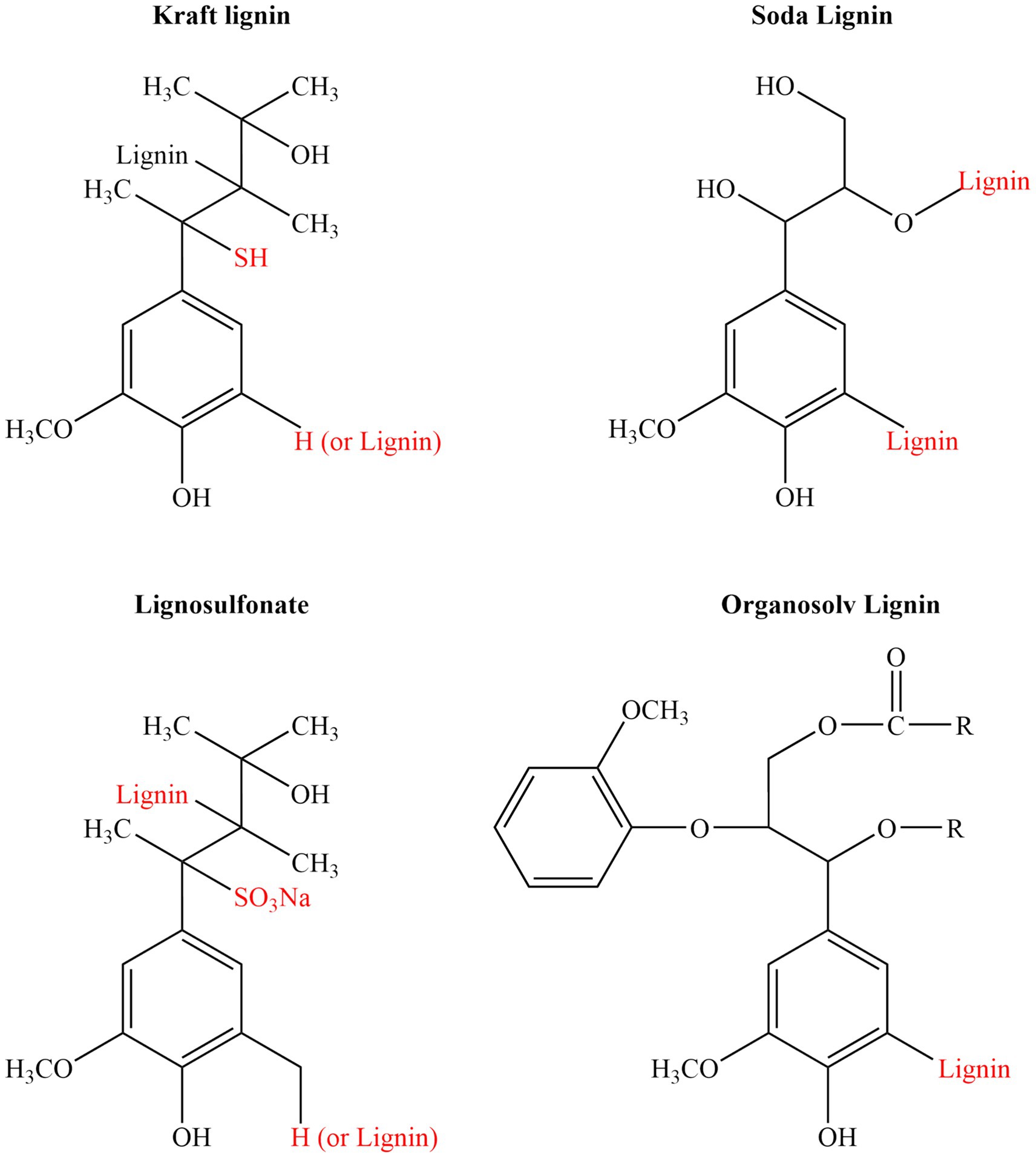Figure 2. Representative chemical structures of technical lignins derived from major industrial extraction methods: Kraft lignin, Soda lignin, Lignosulfonate, and Organosolv lignin. Each type exhibits characteristic functional groups introduced during the pulping process, such as thiol groups (–SH) in kraft lignin, sulfonate groups (–SO₃Na) in lignosulfonates, or additional hydroxyl groups (–OH) in soda and organosolv lignins, which significantly affect their solubility, reactivity, and applications.