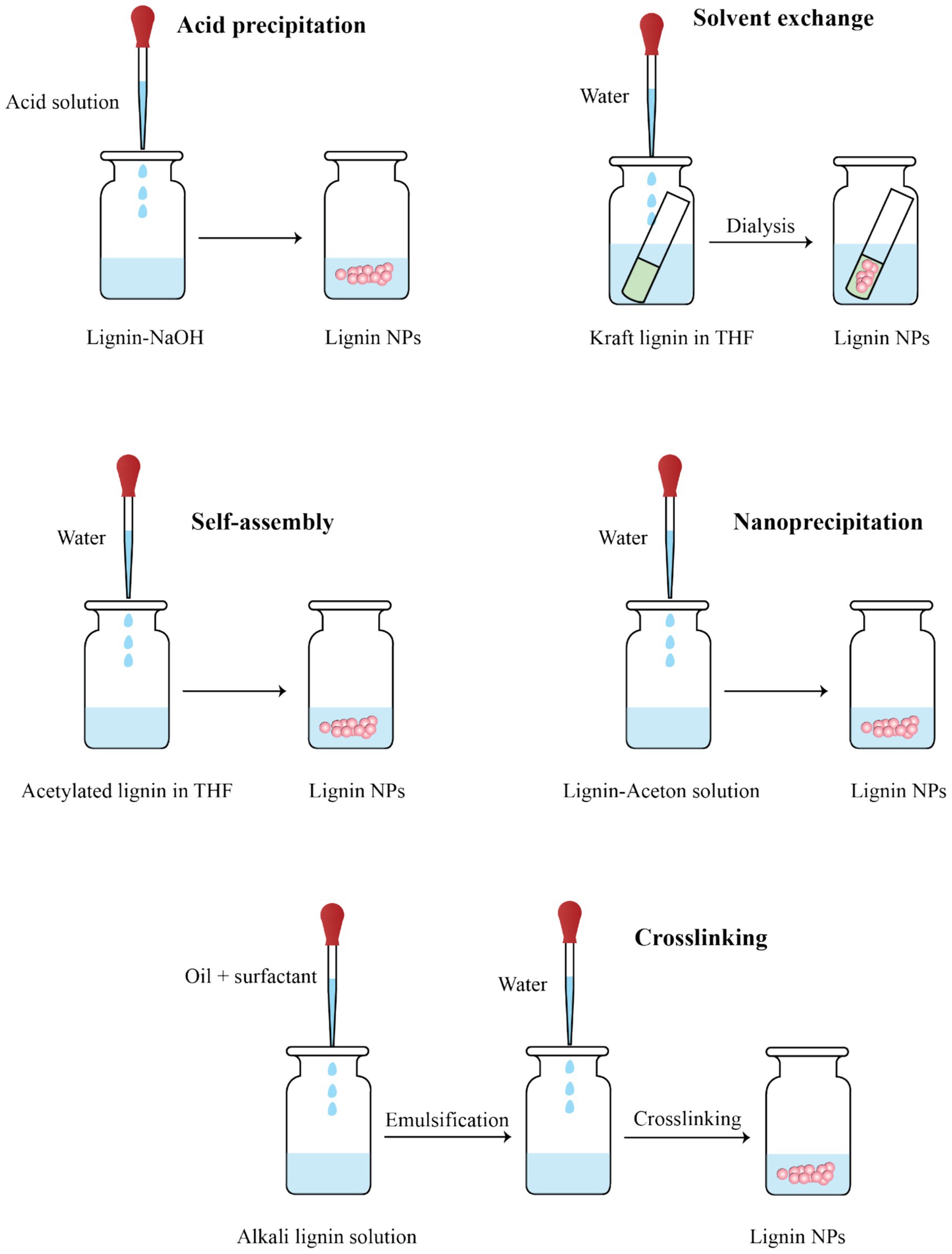Figure 3. Schematic representation of six major methods for synthesizing lignin nanoparticles (LNPs), including acid precipitation, solvent exchange, self-assembly, nanoprecipitation, and interfacial crosslinking.