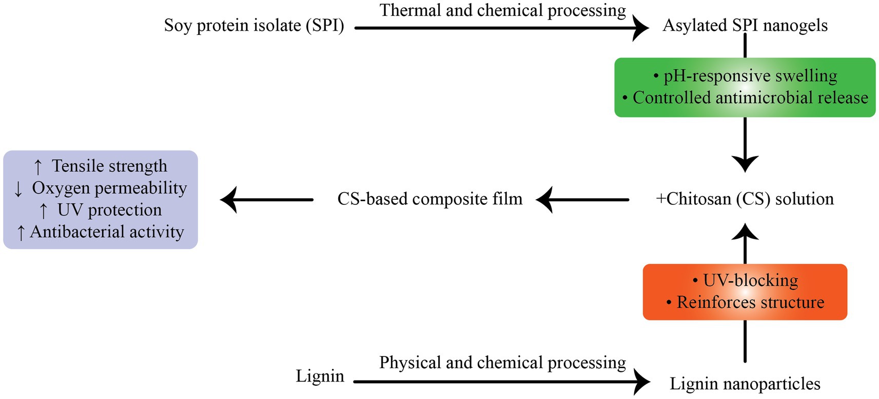 157. Zou, Z, Ismail, BB, Zhang, X, Yang, Z, Liu, D, and Guo, M. Improving barrier and antibacterial properties of chitosan composite films by incorporating lignin nanoparticles and acylated soy protein isolate nanogel. Food Hydrocoll. (2023) 134:108091. doi: 10.1016/j.foodhyd.2022.108091