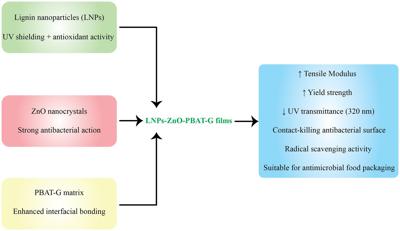The global food industry is increasingly challenged by the urgent need to transition toward more sustainable packaging solutions, driven by escalating concerns over environmental degradation, resource depletion, and human health risks associated with conventional materials (1). Petroleum-derived plastics, aluminum, and perfluorinated compounds have been the mainstay of food packaging due to their excellent barrier properties, mechanical strength, and low cost (2). However, these materials present significant environmental and sustainability drawbacks. Petroleum-based plastics, including polyethylene (PE), polypropylene (PP), and polyethylene terephthalate (PET), are non-biodegradable and widely used for their flexibility and barrier capabilities (3–5), yet their persistence in ecosystems leads to accumulation in landfills and marine environments, contributing to global microplastic pollution (6). The global production of plastics surpassed 400 million tons in 2022, with food packaging accounting for approximately 40% of total consumption (7). Alarmingly, less than 20% of plastics are effectively recycled, exacerbating long-term waste management challenges (8). Although aluminum is technically recyclable and commonly used in food packaging as metalized films or containers, its production from bauxite ore involves highly energy-intensive processes that result in considerable greenhouse gas emissions and ecological disruption through land degradation and mining waste (9). Moreover, the use of metallic films in food packaging raises concerns about material circularity and environmental compatibility, particularly in applications where recovery and recycling are impractical or uneconomical. In contrast, biodegradable packaging materials can be composted or decomposed in natural environments, avoiding such resource-intensive end-of-life scenarios. Perfluorinated organic compounds (PFCs), often used to impart grease and water resistance to packaging, have also been linked to endocrine disruption, bioaccumulation, and long-term ecological toxicity. The detection of PFC residues in food products and human serum samples has further intensified public health concerns (10, 11), reinforcing the urgent need to develop safer, functional, and environmentally benign alternatives such as biodegradable films containing lignin nanocomposites.