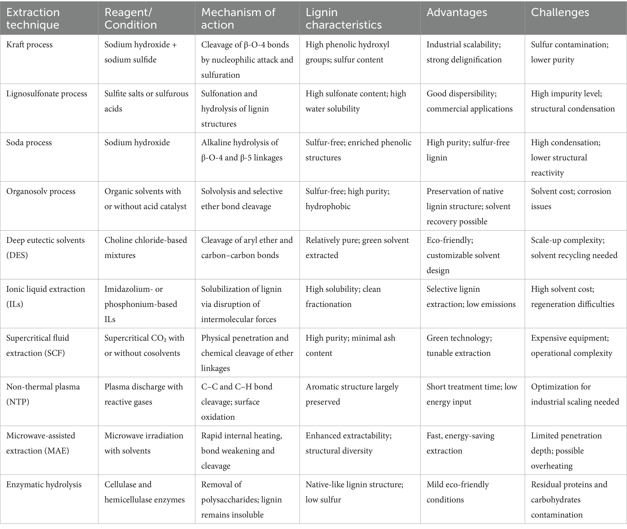 Microwave-assisted extraction (MAE) is widely investigated for accelerating lignin release by applying high-frequency electromagnetic radiation to biomass. Microwave energy penetrates biomass particles and induces rapid dielectric heating via dipolar rotation and ionic conduction, which causes localized rupture of the cell wall and enhances mass transfer (105). However, MAE alone is not sufficient for effective lignin extraction and must be used in combination with chemical agents, typically alkaline (e.g., NaOH) or acidic solutions, that actively cleave ester and ether bonds within the lignocellulosic structure (106). The role of microwave energy in these hybrid systems is to enhance molecular motion, accelerate reaction kinetics, and improve solvent diffusion. More recently, green solvents such as deep eutectic solvents (DESs) have been explored in MAE systems to reduce environmental burden while maintaining high efficiency (107, 108). Despite limitations such as non-uniform heating and specialized reactor requirements, MAE remains a valuable process intensification strategy when integrated with sustainable chemical formulations. Its advantages include shorter processing times, reduced solvent consumption, and potential retention of lignin’s functional moieties (109).