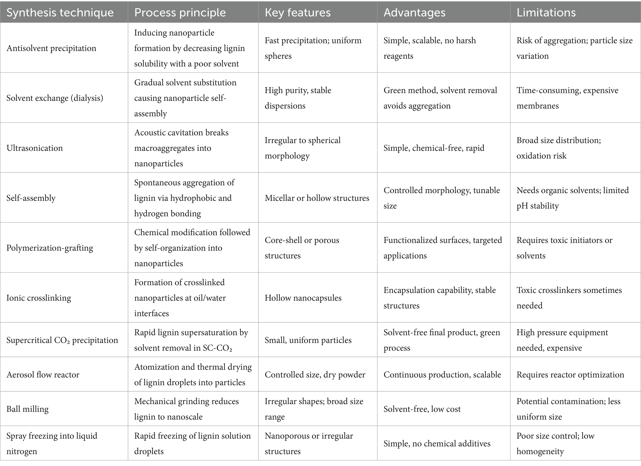Ultrasonication is an efficient, green method for producing LNPs by using acoustic cavitation to induce particle size reduction, bond cleavage, and oxidation without major chemical alteration. Its effectiveness depends on sonication time, power, solvent type, pressure, and temperature (138). Higher ultrasonic intensities and optimized conditions yield smaller, more uniform LNPs, whereas insufficient intensity leads to broader size distributions and irregular morphologies (139). Ultrasonication also promotes functional group exposure, enabling complex formation with other molecules, such as gelatin and chitosan (140, 141). Excessive sonication can cause lignin degradation or, alternatively, radical-induced crosslinking, depending on conditions (142). Advanced techniques like ultrasonic-assisted solvent shifting enhance particle uniformity (143). Despite challenges like non-uniform particle sizes under suboptimal conditions, ultrasonication remains a versatile, scalable, and environmentally friendly approach for nanostructured lignin production (144, 145).