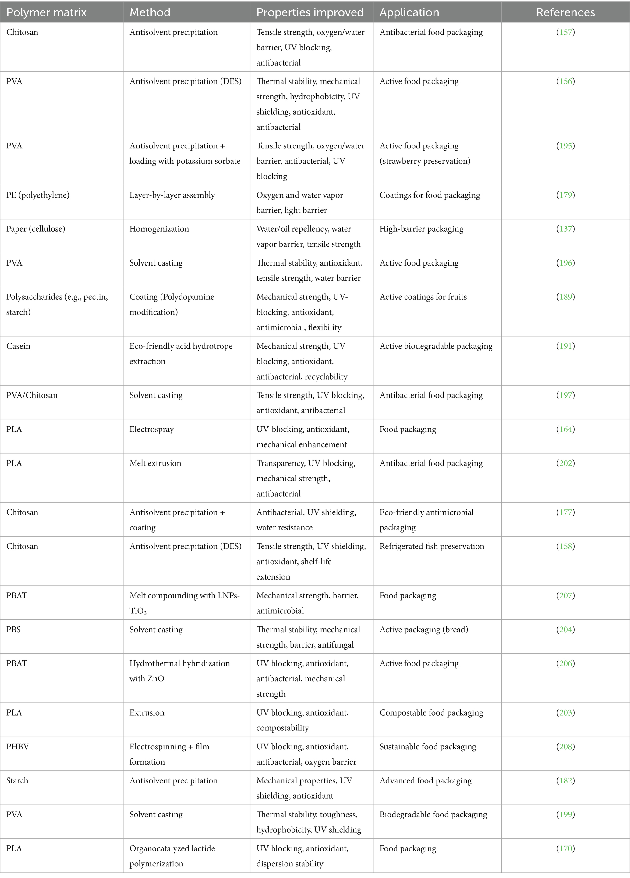 Controlling the particle size and surface charge is crucial, as these parameters affect the stability of the nanoparticles and their interaction with the biodegradable polymer matrix. Incorporating LNPs into biodegradable films has demonstrated substantial improvements in mechanical properties, barrier functions, and active packaging functionalities. Studies have shown that LNPs enhance tensile strength, Young’s modulus, and elasticity while reducing water vapor permeability and oxygen transmission rates (34). Furthermore, LNPs act as UV-blocking agents, protecting packaged foods from photooxidation and extending shelf life (35). The antioxidant activity of LNPs helps to retard lipid oxidation in packaged foods, while their antimicrobial properties inhibit bacterial and fungal growth, reducing spoilage and enhancing food safety without relying on synthetic additives (19, 36). Such multifunctional benefits position LNPs as attractive candidates for developing active and intelligent packaging systems.