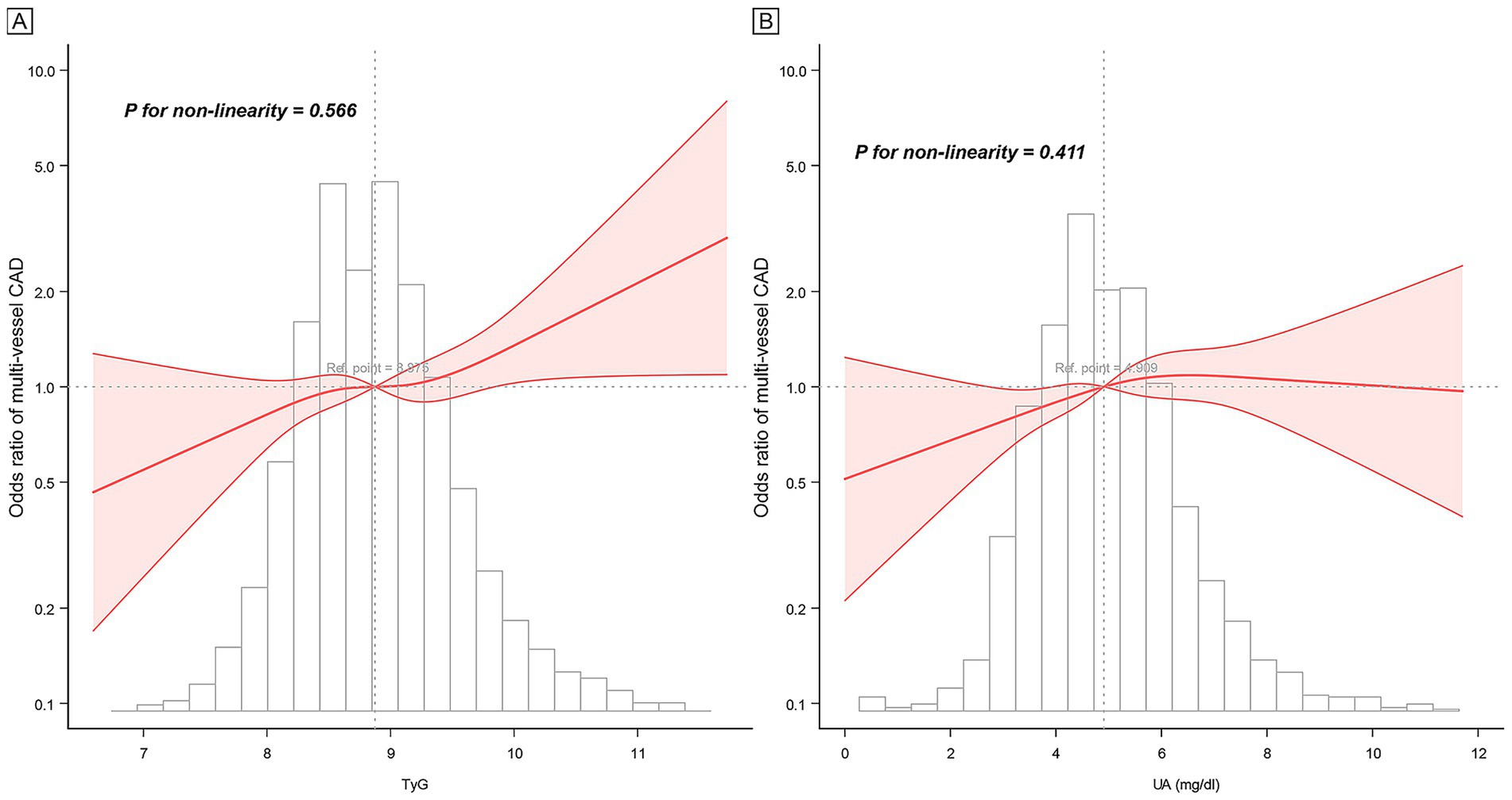Two plots showing the relationship between variables and odds ratio of multi-vessel CAD. Panel A depicts TyG values and Panel B depicts UA levels. Both plots feature histograms overlaid with red lines and shaded areas representing smoothed curves. The odds ratio is on the vertical axis, with reference points indicated. P-values for non-linearity are 0.566 for TyG and 0.411 for UA.