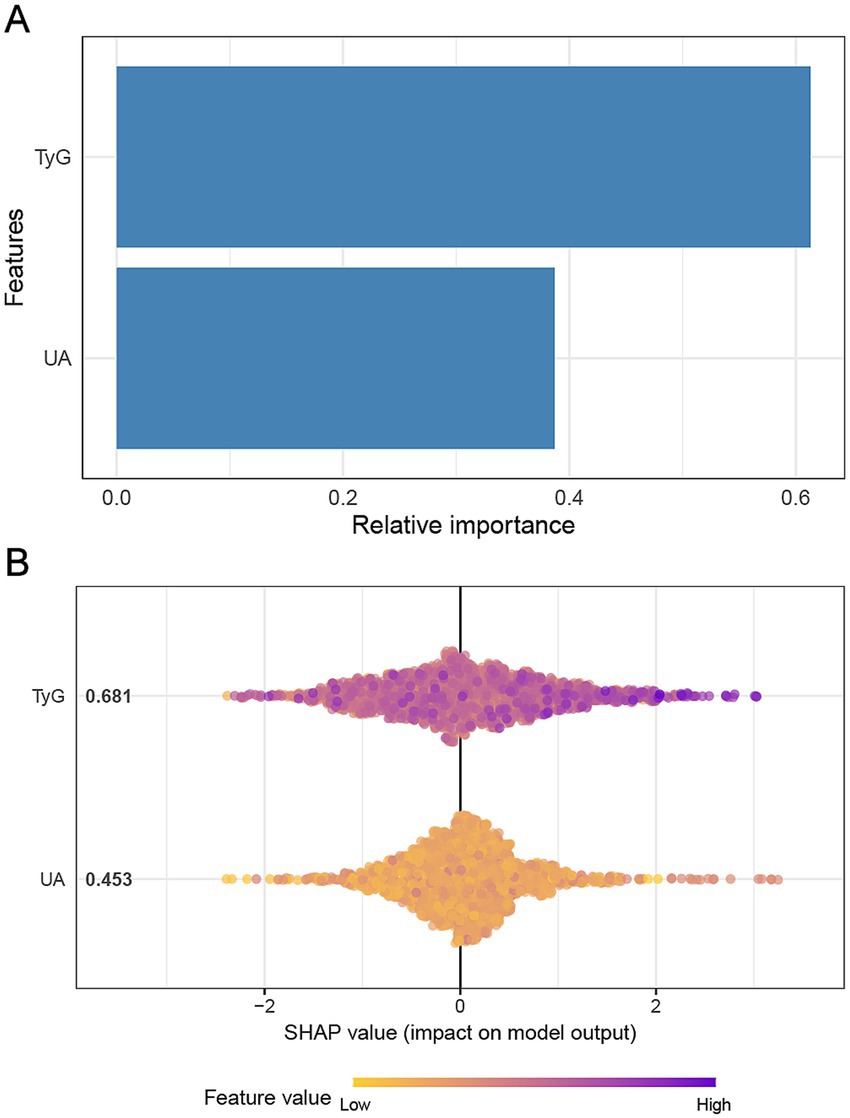 Panel A shows a horizontal bar chart with two features: TyG with high relative importance and UA with moderate importance. Panel B displays a SHAP value plot with TyG at 0.681 and UA at 0.453, indicating feature impact on model output. Color gradient reflects feature value from low (yellow) to high (purple).