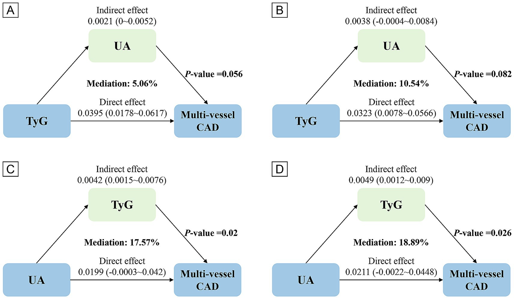 Conclusion: The TyG index correlated more strongly with multi-vessel CAD compared to UA. Hyperuricemia correlated with multi-vessel CAD exclusively at elevated TyG levels, with TyG mediating the link between uric acid and CAD severity.