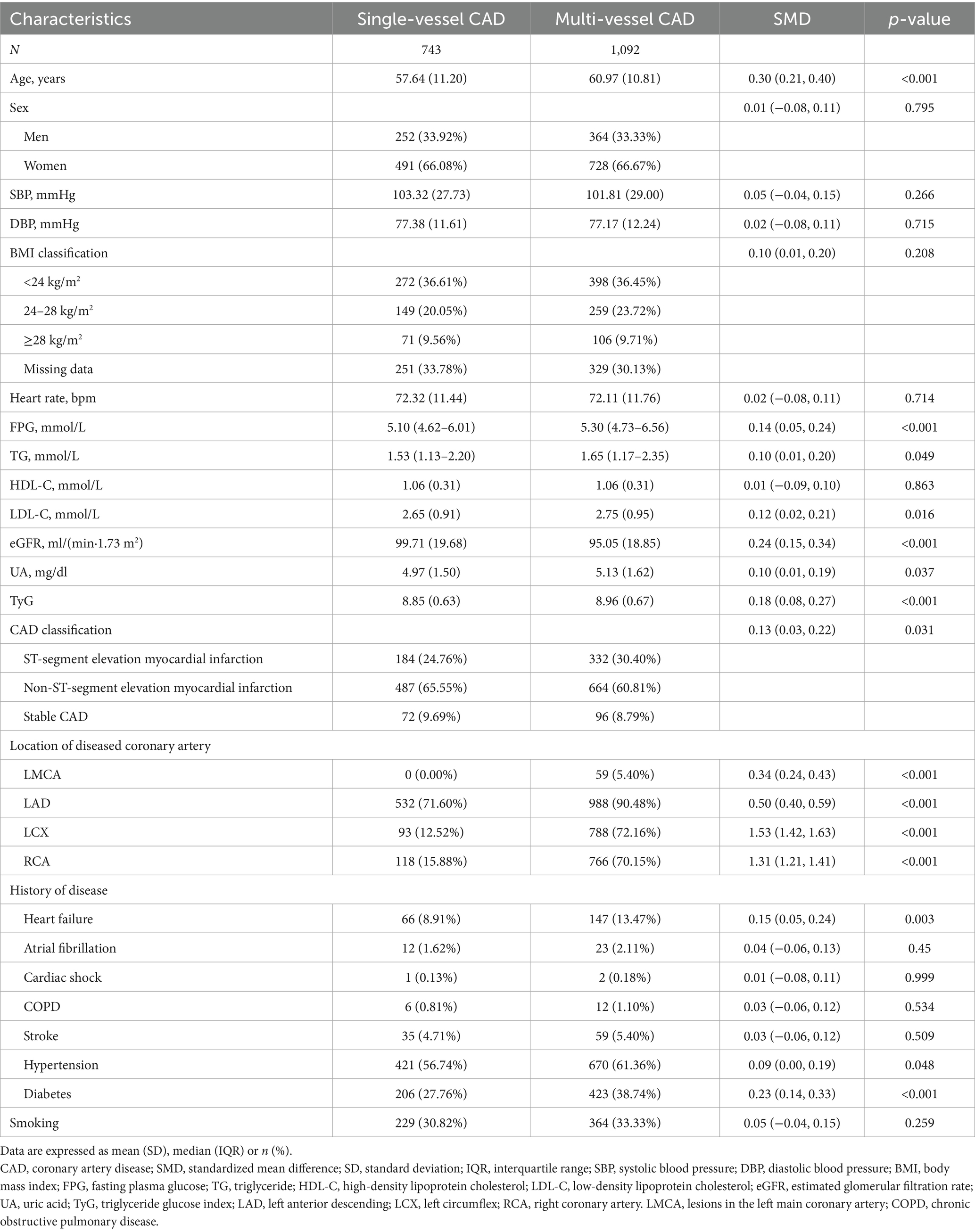 In this study involving 1,835 newly diagnosed CAD patients, notable demographic and clinical differences were found between individuals with single-vessel and multi-vessel CAD. The multi-vessel CAD group had an older average age of 60.97 years, compared to 57.64 years in the single-vessel group (p < 0.001). The groups showed no significant difference in sex distribution. Blood pressure measurements and heart rate showed no significant differences. FPG levels were notably elevated in the multi-vessel CAD group (p < 0.001), suggesting a link between impaired glucose metabolism and increased severity of coronary artery involvement. Serum TG levels were marginally higher in the multi-vessel group (p = 0.049).