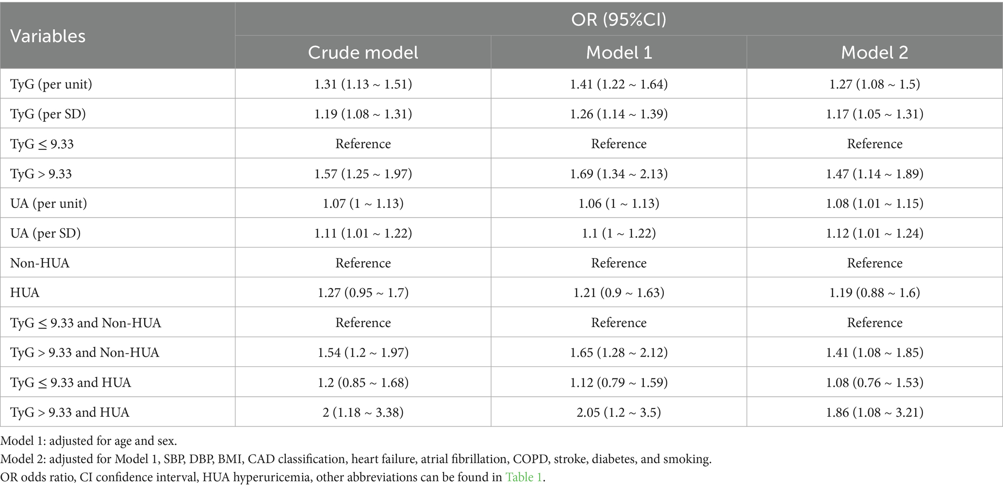 3.2 Relationship between TyG index, UA, and multi-vessel CAD