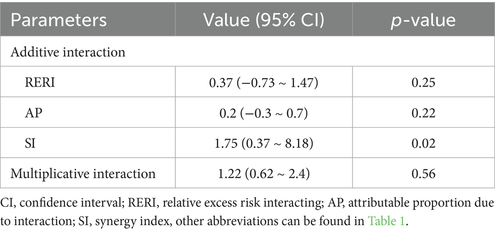 Our analysis found no significant additive or multiplicative interactions between the TyG index and UA concerning multi-vessel CAD risk. While this suggests that the effects of these markers on CAD risk may be largely independent, the observed significant synergy index (SI) value of 0.02 warrants further consideration. This seemingly contradictory finding—where SI is significant but relative excess risk due to interaction (RERI) and attributable proportion (AP) are not—could be attributed to the complex interplay between insulin resistance and hyperuricemia in the pathogenesis of CAD. It is possible that the lack of significant interaction reflects the limitations in capturing the full scope of biological and clinical interactions, particularly given the absence of data on drug use that might affect UA levels or insulin sensitivity. The lack of a significant interaction in our study contrasts with previous research, such as that by Wu et al. (7), who identified a significant interaction between TyG and UA in predicting adverse cardiovascular outcomes in patients undergoing coronary artery bypass grafting (CABG). Differences in study populations, such as the presence of comorbidities or treatment regimens, and variations in outcomes of interest, may explain these conflicting results. Furthermore, the statistical power in our study might have been insufficient to detect subtle interactions, particularly given the large sample size and the complexity of the potential interactions. Therefore, while our findings suggest no significant additive or multiplicative interactions, it is essential to interpret this result within the context of the study’s limitations, including the lack of direct measurement of drug effects.