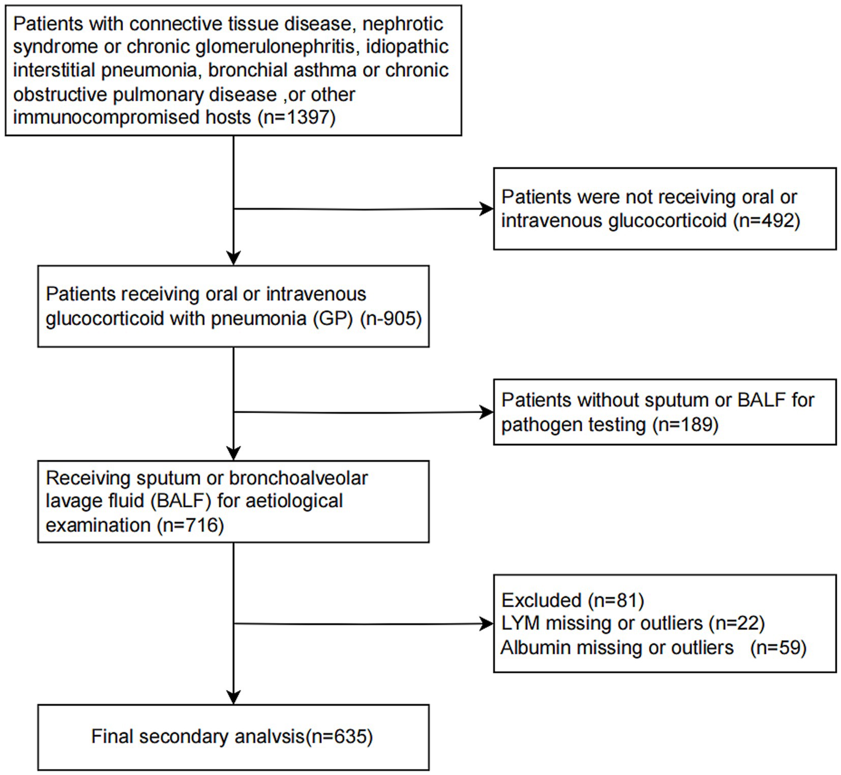 This study was based on a publicly available dataset retrieved from the Dryad Digital Repository,1 which originated from a multicenter retrospective cohort investigation by Li et al. (22). The original study involved hospitalized adult patients diagnosed with pneumonia who received glucocorticoid therapy, with or without additional immunosuppressive agents. The dataset comprises detailed clinical, laboratory, microbiological, treatment, and outcome data.