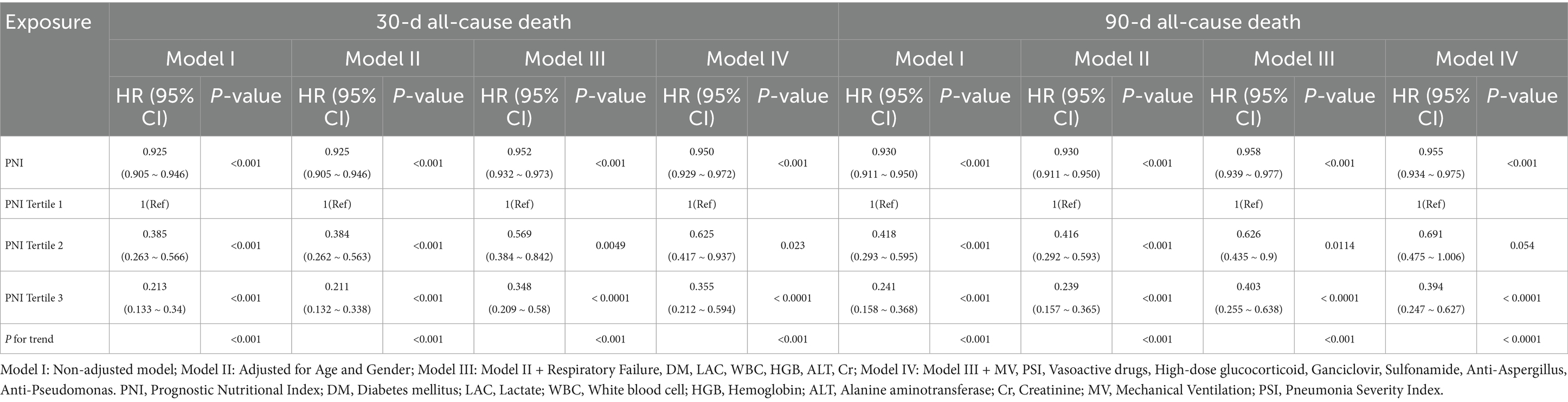 Pneumonia has imposed a significant disease burden on society, and the lack of direct and effective biomarkers for prognosis continues to pose a challenge. Additionally, there are limited studies on the relationship between the PNI and pneumonia patients in China. Our analysis, based on a cohort of 635 Chinese pneumonia patients, revealed substantial 30-day and 90-day mortality rates of 22.7 and26.1%, respectively. After adjusting for confounders, PNI showed a significant negative association with 30-day mortality [HR, 0.950 (0.929–0.972), p < 0.001] and 90-day mortality [HR, 0.955 (0.934–0.975), p < 0.001]. The PNI demonstrated predictive value for 30-day and 90-day mortality in Chinese pneumonia patients, with AUCs of 0.699 and 0.686, respectively (Supplementary Figure S1). These findings align with the pathophysiological interplay between hypoalbuminemia—a marker of catabolic stress and endothelial dysfunction—and lymphopenia, which reflects impaired adaptive immunity (28). However, given the number of subgroup analyses conducted, the possibility of false-positive results due to multiple comparisons cannot be excluded. These findings should therefore be interpreted with caution and confirmed in future prospective studies.