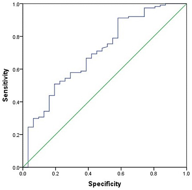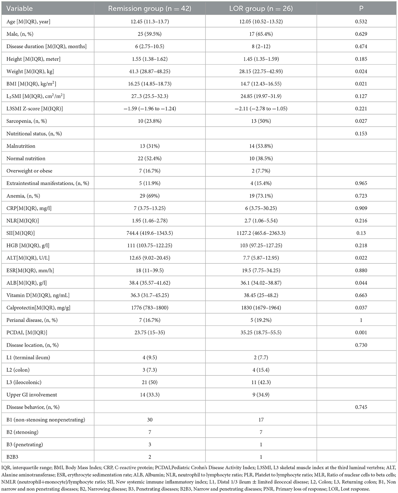 After a one-year follow-up, 26 children who received IFX treatment were found to have LOR. The incidence of sarcopenia in LOR patients was significantly higher than that in remission group (50% vs. 23.8%, P = 0.027) (Figure 3). Baseline weight, BMI, ALT, and ALB levels were significantly lower in LOR patients than in those in remission (P < 0.05), while FC and PCDAI levels were higher in the LOR (P < 0.05) (see Table 4). Binary logistic regression analysis identified that PCDAI as an independent risk factor for loss of response to IFX treatment (OR=1.066, 95% CI 1.027–1.107, P = 0.001).