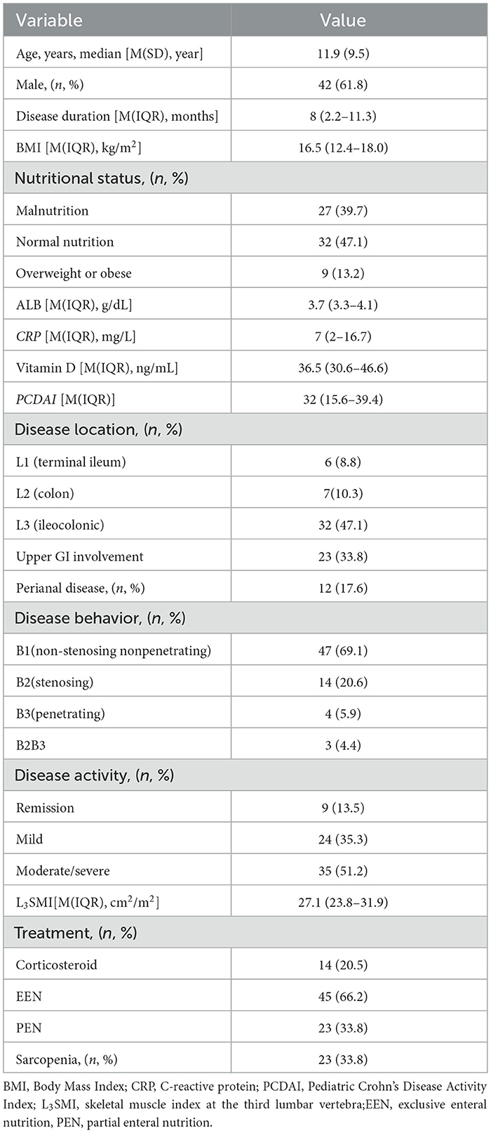 A total of 128 patients with CD completed CTE. Of these, 68 patients met the inclusion criteria and were included in this study. The mean age was 11.9 years (SD 9.5). Forty-two (61.8%) patients were boys. The median disease duration was 8 months (IQR, 2.3–11.3 months). Thirty-two patients (47.1%) had an ileo-colonic localization. 66.2% of patients received exclusive enteral nutrition (EEN), while 33.8% received partial enteral nutrition (PEN). Demographic data are presented in Table 1. Based on the L3SMI Z-score, 23 patients (33.8%) were diagnosed with sarcopenia. Two patients exhibited sarcopenia during the remission period. One in nine overweight or obese patients had sarcopenia, while six out of 32 children with normal nutritional status had sarcopenia.