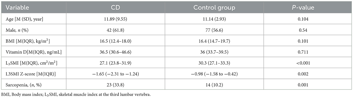 A total of 136 healthy children were included in the control group, all of whom underwent abdominal CT due to digestive foreign bodies, back pain or acute trauma. There were no significant differences in age, gender, BMI, or Vitamin D between the control group and the CD group (P > 0.05, Table 2). However, the L3SMI and L3SMI Z-score in the CD group were significantly lower than those in the control group (P < 0.001 and P = 0.002, respectively). Additionally, the incidence of sarcopenia was significantly higher in the CD group compared to the control group (33.8% vs. 10.2%, P = 0.001).