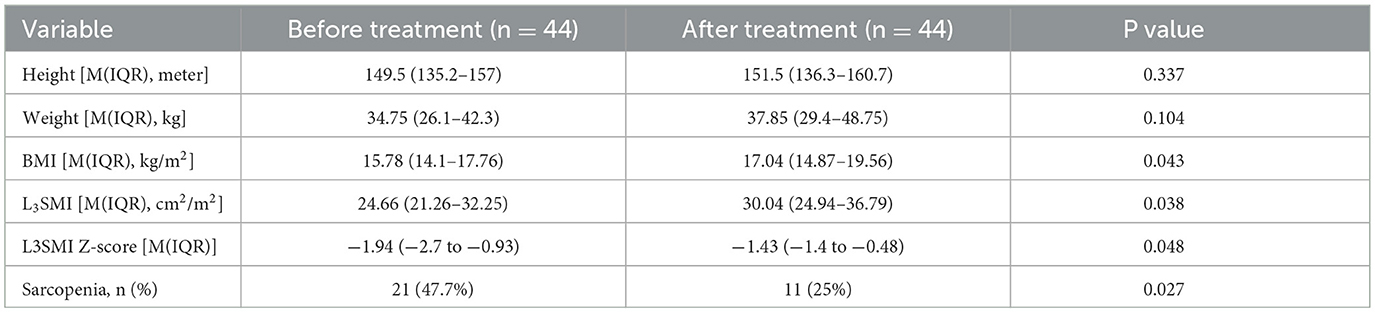All patients received IFX and EEN/PEN treatment. Among them, 44 patients required re-evaluation with CTE for disease assessment, with an average interval of 203.5 days between evaluations. After treatment, there were no significant changes in height or weight, however, BMI, L3SMI, and the L3SMI Z-score increased significantly (P < 0.05). Additionally, the proportion of patients with sarcopenia decreased significantly, from 47.7% to 25% (P = 0.027) (see Table 5).
