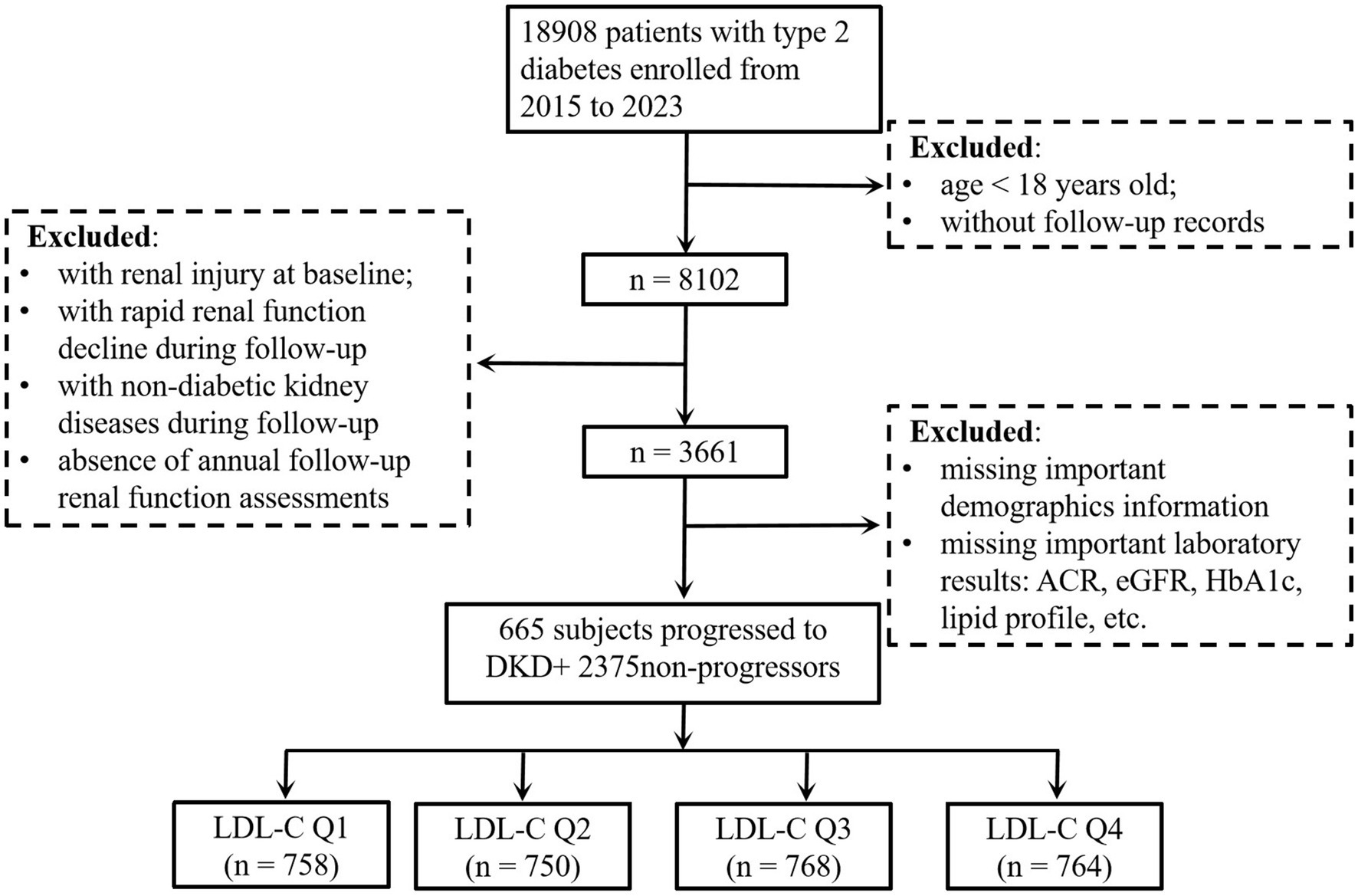 Figure 1. Flowchart of the subjects. eGFR, estimated glomerular filtration rate; ACR, albumin-to-creatinine ratio; DKD, diabetic kidney disease; HbA1c, glycated hemoglobin; LDL-C, low-density lipoprotein cholesterol.
