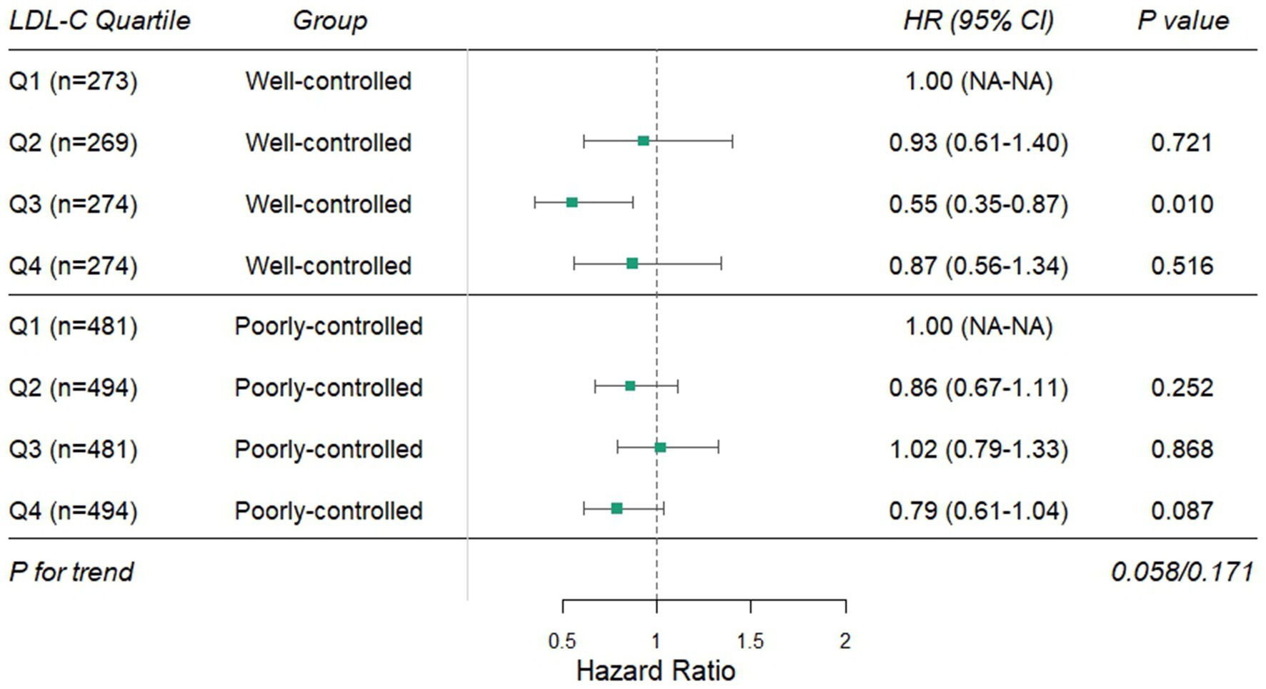 Figure 2. Stratified effects of LDL-C quartiles on DKD risk by glycemic control status. DKD, diabetic kidney disease; LDL-C, low-density lipoprotein cholesterol.