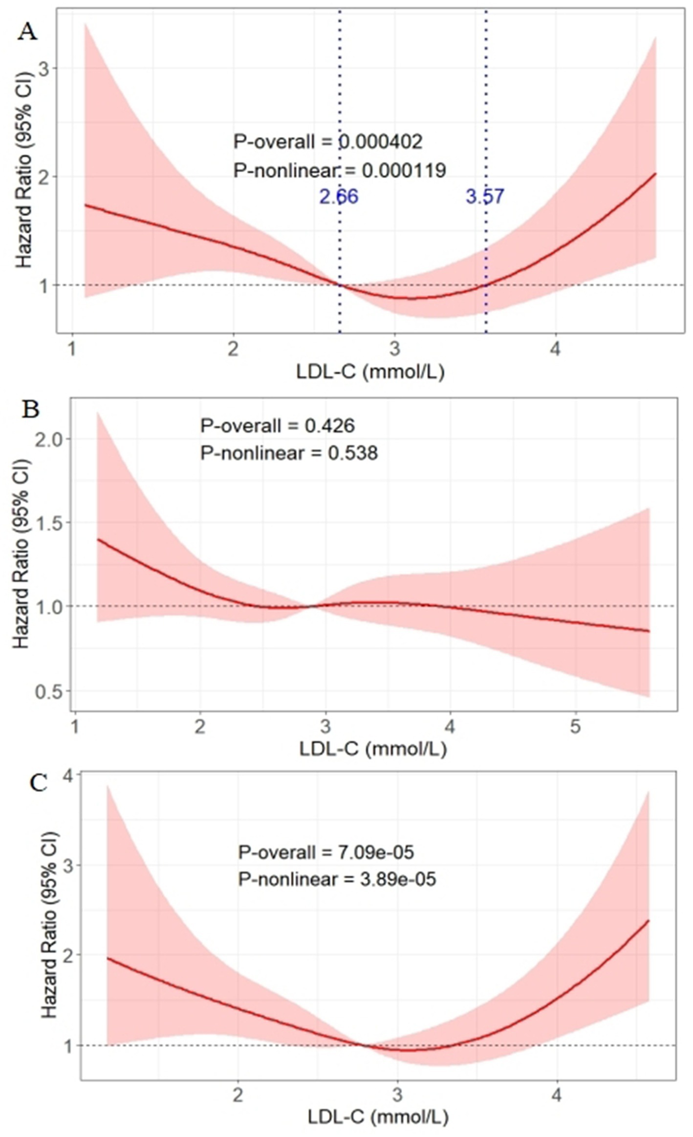 Figure 3. Association between LDL-C levels and DKD onset risk analyzed via RCS in the well-controlled glycemic subgroup (A), poorly controlled subgroup (B), and the well-controlled subgroup after excluding baseline statin/fibrate users (C). The solid red line represents the hazard ratio for DKD; the shaded pink area represents the 95% confidence interval. The blue lines represent the curve intersecting the HR = 1 reference line at LDL-C = 2.66 mmol/L and 3.57 mmol/L. DKD, diabetic kidney disease; LDL-C, low-density lipoprotein cholesterol.