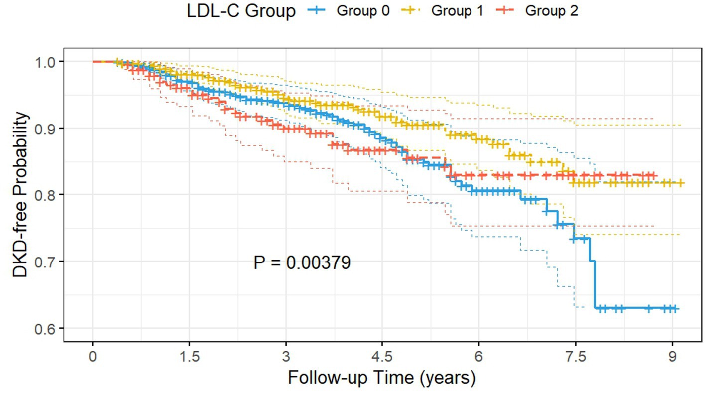 Figure 4. The Kaplan–Meier survival curves demonstrated that the intermediate LDL-C group had significantly lower cumulative DKD incidence compared to the low and high LDL-C groups. Group 0: subjects with low LDL-C (<2.66 mmol/L); Group 1: subjects with intermediate LDL-C (2.66–3.57 mmol/L); Group 2: subjects with high LDL-C (>3.57 mmol/L); DKD, diabetic kidney disease; LDL-C, low-density lipoprotein cholesterol.