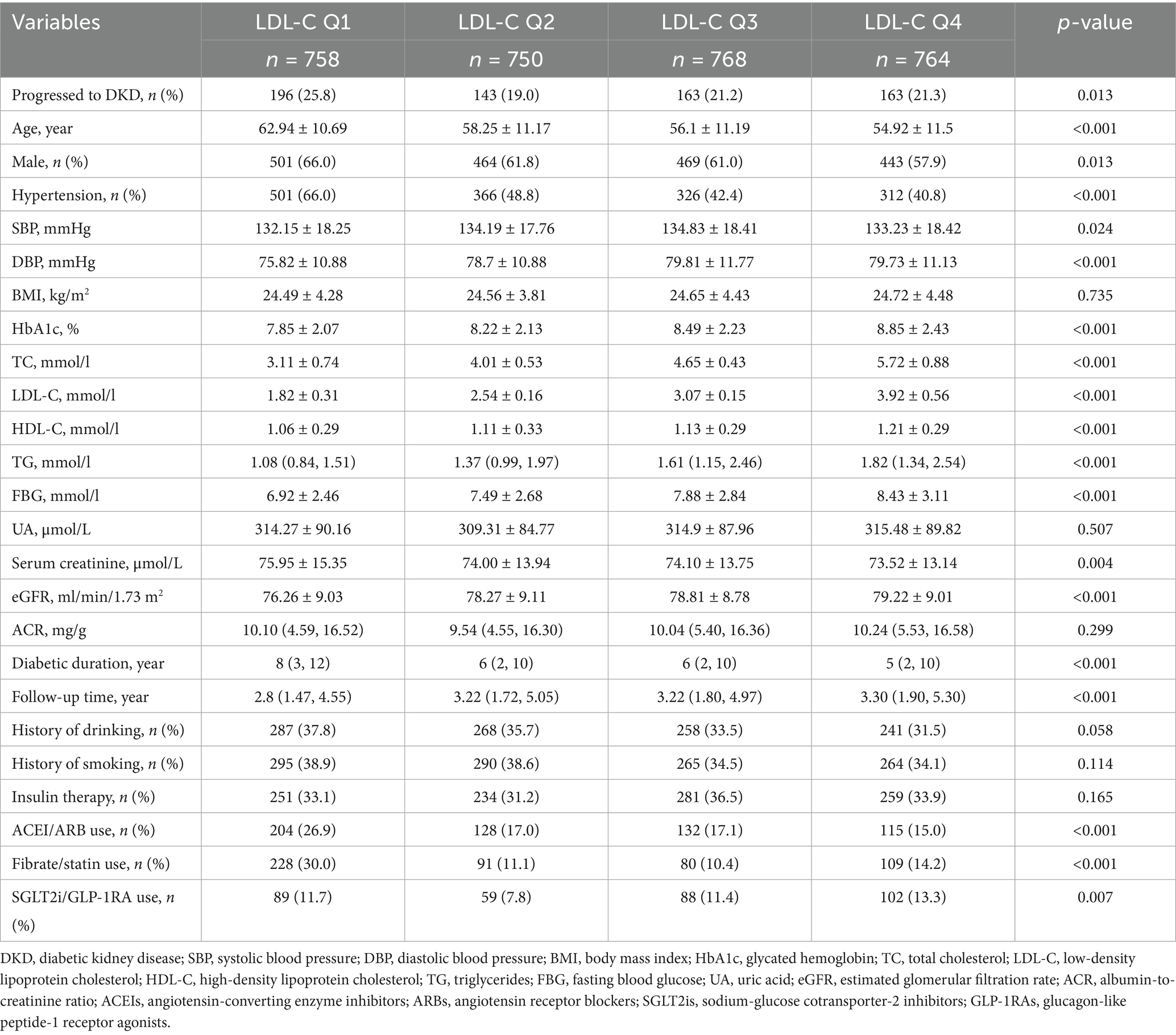 This study enrolled 3,040 T2D patients without baseline DKD. The mean age was 57.3 ± 11.58 years; 61.7% were male. The prevalence of hypertension was 45.4%, the median diabetes duration was 6 years, and the median follow-up time was 3.13 years. Patients were stratified into four groups (Q1–Q4) based on baseline LDL-C quartiles, with significant differences in baseline characteristics among all groups (Table 1). The lowest LDL-C group (Q1) exhibited significantly higher DKD progression rates than the other groups (p = 0.013), with the lowest risk observed in Q2. Patients in the highest LDL-C group (Q4) were younger (p < 0.001), had a lower proportion of male patients (57.9% vs. Q1: 66.0%; p = 0.013), and exhibited a decreasing trend in hypertension prevalence as LDL-C levels increased (p < 0.001). Additionally, HbA1c, FBG, TC, and TG levels all increased with higher LDL-C (all p < 0.001). For renal function, the highest LDL-C group exhibited higher baseline eGFR (p < 0.001), but no intergroup differences in ACR were observed (p = 0.299). Additionally, the lowest LDL-C group (Q1) showed higher usage rates of ACEI/ARB medications (p < 0.001) and statins/fibrates (p < 0.001), whereas SGLT2i/GLP-1RA medications were more frequently used in the highest LDL-C group.