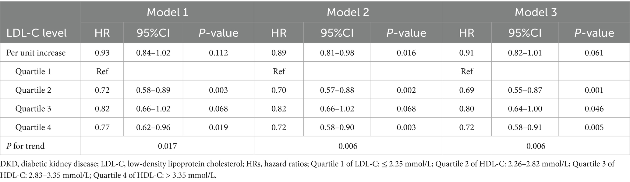 Continuous variables are presented as mean ± standard deviation or median (interquartile range), and categorical variables are presented as frequencies (percentages). Differences across LDL-C quartiles (Q1–Q4) were assessed using ANOVA, the Kruskal–Wallis test, or the chi-square test, as appropriate. The association between baseline LDL-C levels and DKD risk was evaluated using Cox proportional hazards models, with LDL-C analyzed both as a continuous variable and categorical quartiles. Multivariable adjustments were implemented hierarchically across three models: Model 1 was adjusted for age and sex; Model 2 extended adjustments to include SBP, BMI, HbA1c, diabetes duration, and hypertension status; Model 3 further incorporated baseline ACR, HDL-C, TG, eGFR, and use of SGLT2i/GLP-1RAs. Covariates were selected based on either (1) factors identified as DKD risk determinants in the previous studies (6, 21) or (2) variables with significant between-group differences (p < 0.05) in univariate analyses of this cohort.