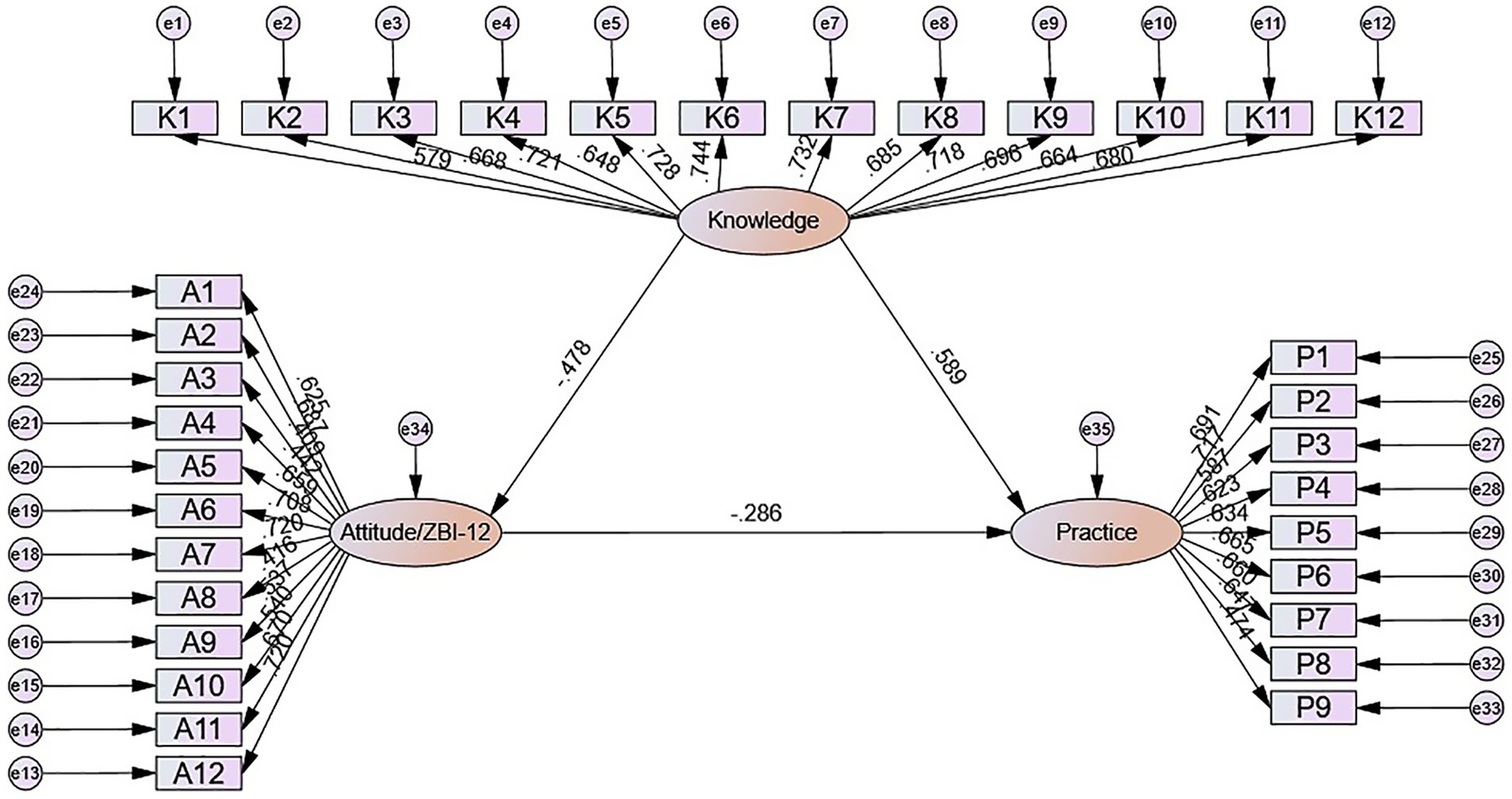 Descriptive analyses were performed to summarize the demographic characteristics of the participants and the distribution of knowledge (K), attitude (A), and practice (P) scores. Continuous variables were expressed as means and standard deviations (SD), whereas categorical variables and individual item-level responses were reported as frequencies and percentages. Group differences in KAP scores across sociodemographic variables were assessed using univariate analyses for independent samples. For comparisons involving two groups, the Mann–Whitney U test was applied, while the Kruskal–Wallis H test was used for comparisons among three or more groups. These non-parametric methods were chosen because the data did not meet the assumptions of normality or homogeneity of variance, as assessed by the Shapiro–Wilk and Levene’ s tests. Spearman’ s rank correlation coefficient was calculated to evaluate the monotonic associations among knowledge, attitude (caregiver burden), and practice scores, given the ordinal nature of the data and their non-normal distribution. Missing data were minimal because all items in the electronic questionnaire were set as mandatory, and paper-based responses were checked for completeness by research assistants; thus, no imputation procedures were required. As multiple univariate comparisons were conducted, results were interpreted with caution, but no formal adjustment for multiple testing was applied in order to retain sensitivity to potential associations. To further examine the interrelationships between K, A, and P, a structural equation model (SEM) was constructed using the individual items from each dimension as observed indicators. The model was evaluated using standard fit indices, including the root mean square error of approximation (RMSEA), incremental fit index (IFI), Tucker–Lewis index (TLI), and comparative fit index (CFI). Parameter estimates were reported in standardized form. Model estimation and modification were based on theoretical considerations and empirical fit indicators. All statistical analyses were conducted using IBM SPSS Statistics for Windows, version 27.0 (IBM Corp., Armonk, NY, United States), and AMOS version 26.0 (IBM Corp., Armonk, NY, United States). A two-tailed p-value less than 0.05 was considered to indicate statistical significance.