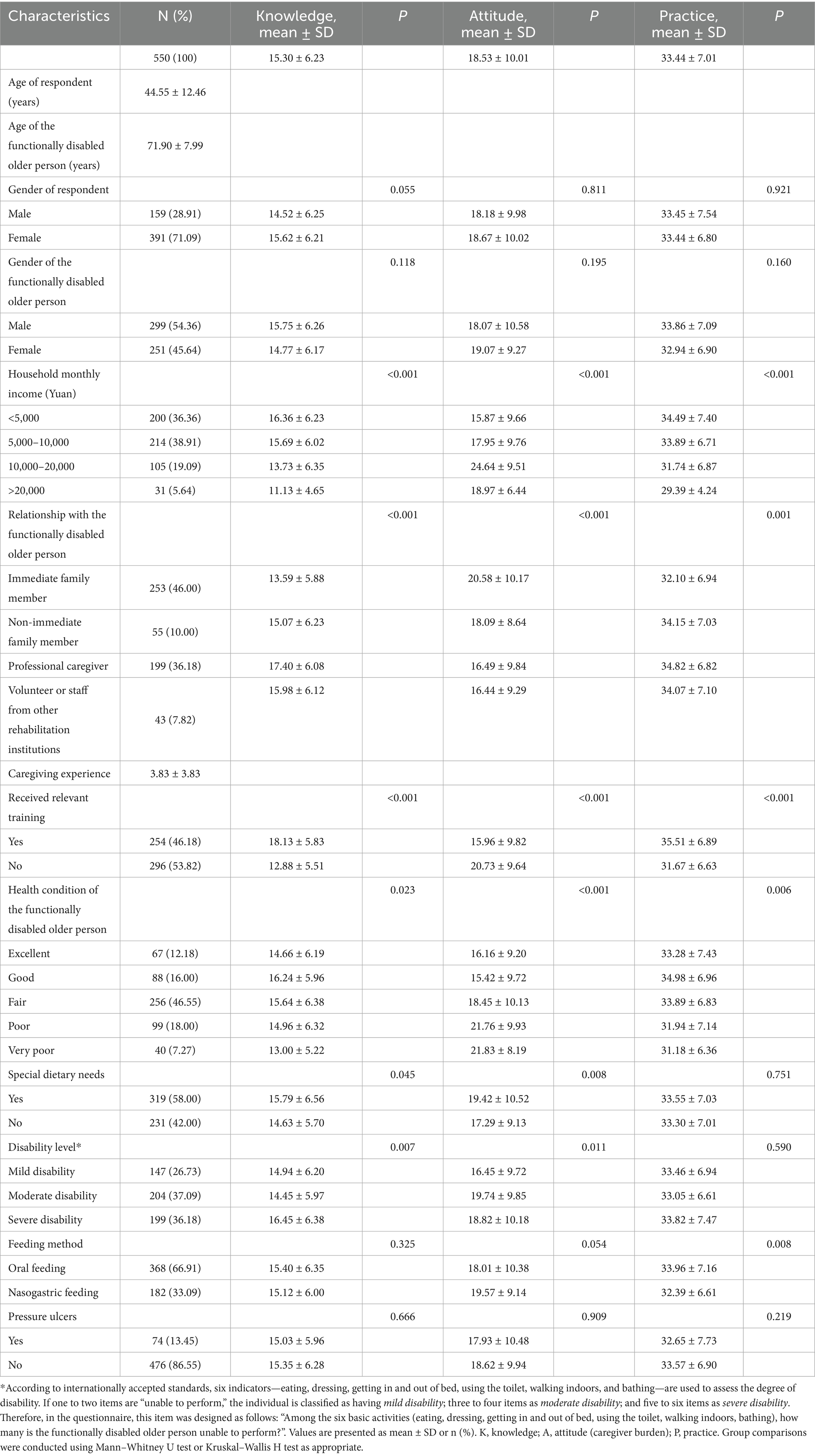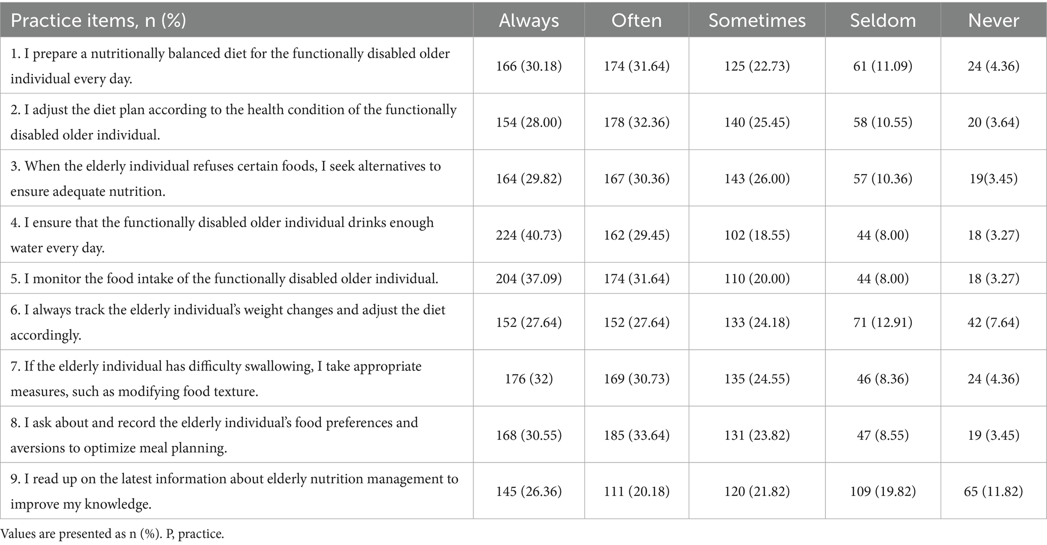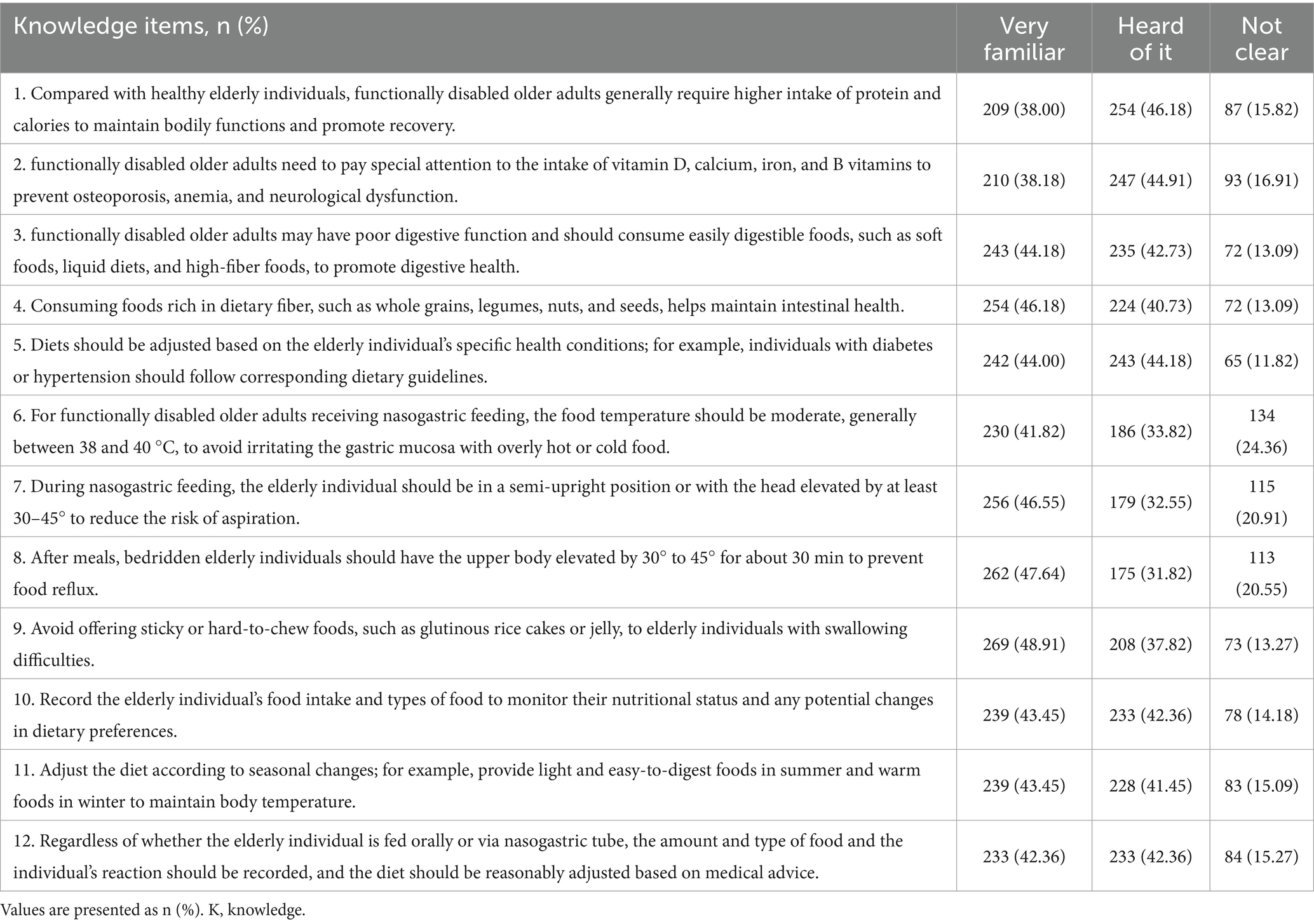 Citation: Jia J, Guo Y, Tian L, Li W, Cao X and Shang Y (2025) Knowledge, attitudes, and practices of caregivers of functionally disabled older adults regarding nutritional management. Front. Nutr. 12:1660965. doi: 10.3389/fnut.2025.1660965