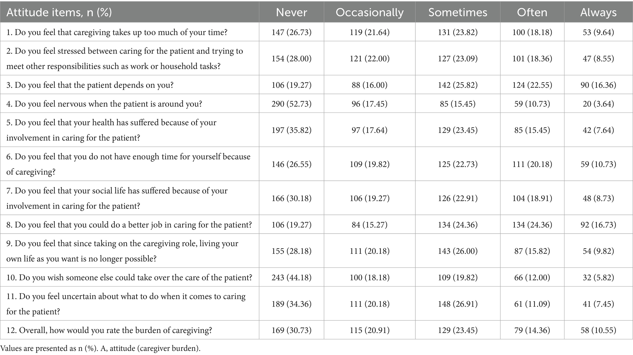 This study included 550 caregivers of functionally disabled older adults, predominantly female (71.09%), with a mean age of 44.55 ± 12.46 years. Caregivers were primarily immediate family members (46%) or professional caregivers (36.18%), caring for elderly individuals with a mean age of 71.90 ± 7.99 years (Table 1). A series of chronic diseases were the main cause of disability among the functionally disabled older adults (411 cases), followed by aging of body functions and decline of senses (253 cases) (Supplementary Figure S2A). When it comes to the current chronic conditions of the functionally disabled older adults, the highest proportion is cardiovascular diseases (349 cases), followed by metabolic diseases (190 cases) and neurological diseases (178 cases) (Supplementary Figure S2B).