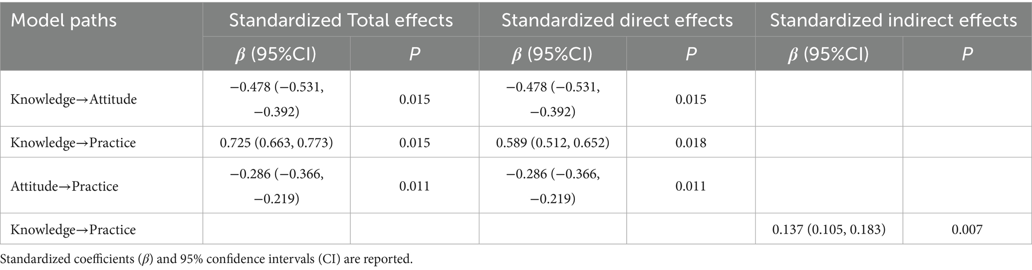 Results: A total of 550 valid responses were included, yielding an effective response rate of 86.21%. The majority of respondents were female (71.09%). The mean knowledge, attitude, and practice scores were 15.30 ± 6.23 (possible range: 0–24), 18.53 ± 10.01 (possible range: 0–48), and 33.44 ± 7.01 (possible range: 9–45), respectively. SEM indicated significant associations from knowledge to attitude (β = −0.478, p = 0.015) and practice (β = 0.589, p = 0.018), and from attitude to practice (β = −0.286, p = 0.011). In addition, knowledge showed an indirect association with practice through attitude (β = 0.137, p = 0.007).