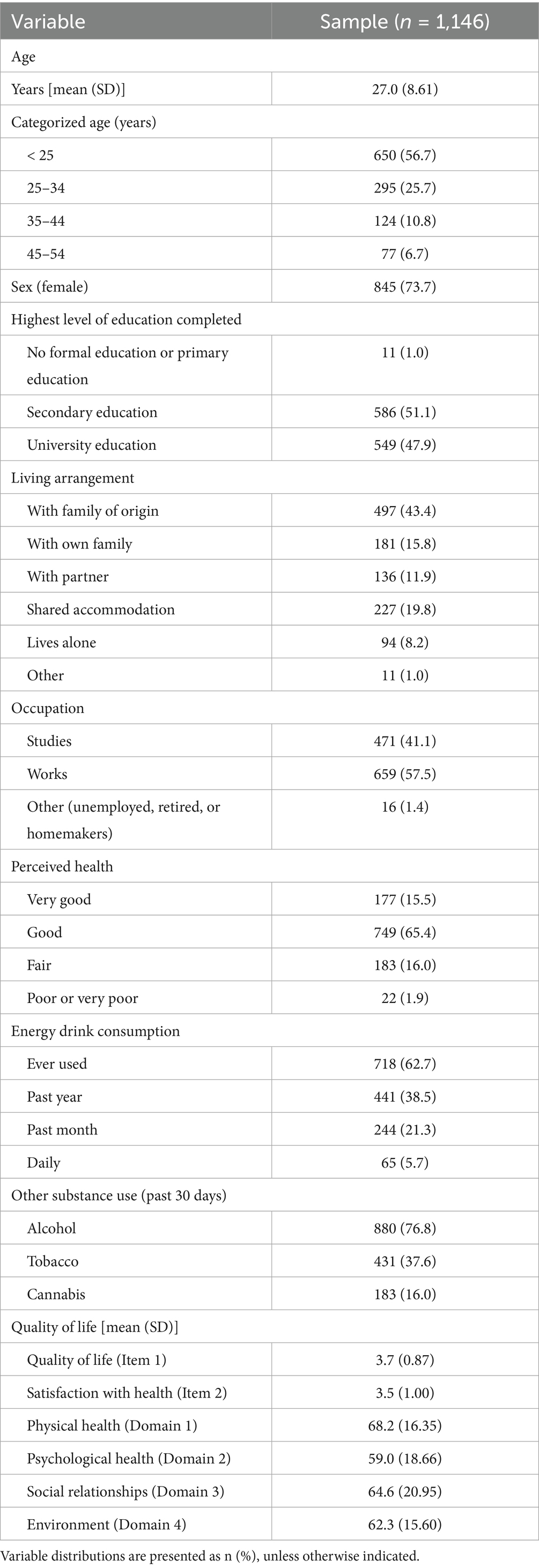 Method: A cross-sectional design was used with a sample of 1,146 participants aged 18 to 54 years, recruited by convenience sampling through university mailing lists and social media. The web-based questionnaire collected self-reported their energy drink and other substance use and their quality of life (WHOQOL-BREF). Multivariable linear and ordinal logistic regressions were stratified by sex (given a significant sex×ED interaction) and adjusted for age, living arrangement, education, occupation, self-rated health, and past-month use of alcohol, tobacco, and cannabis.