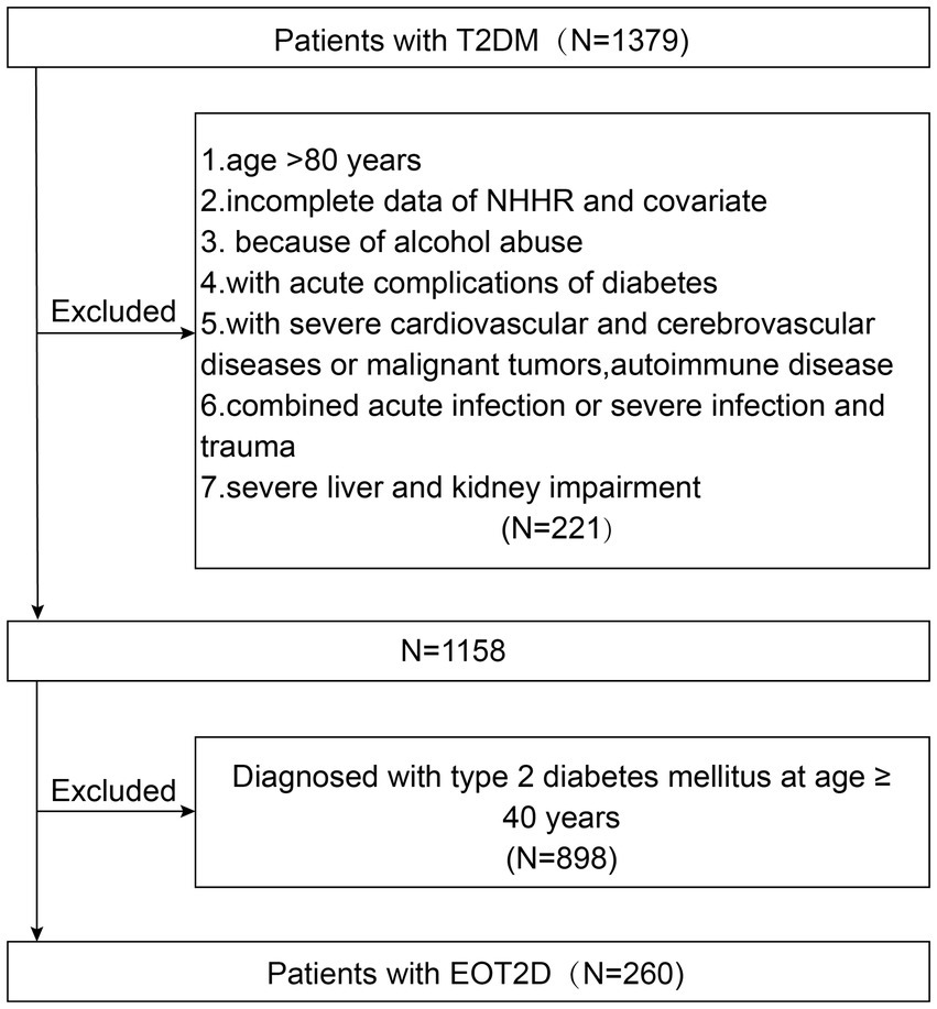 Although previous studies have suggested associations between NHHR and both T2DM and NAFLD, the predictive value of NHHR for the high-risk population with EOT2D complicated by NAFLD remains unclear. Given that patients with EOT2D and NAFLD typically exhibit more severe metabolic abnormalities and poorer clinical outcomes, early identification of this group holds significant clinical importance. Therefore, this study aims to investigate the association between NHHR and EOT2D, as well as their co-occurrence with NAFLD, with the goal of providing new evidence-based support for the early identification and intervention of this high-risk population.