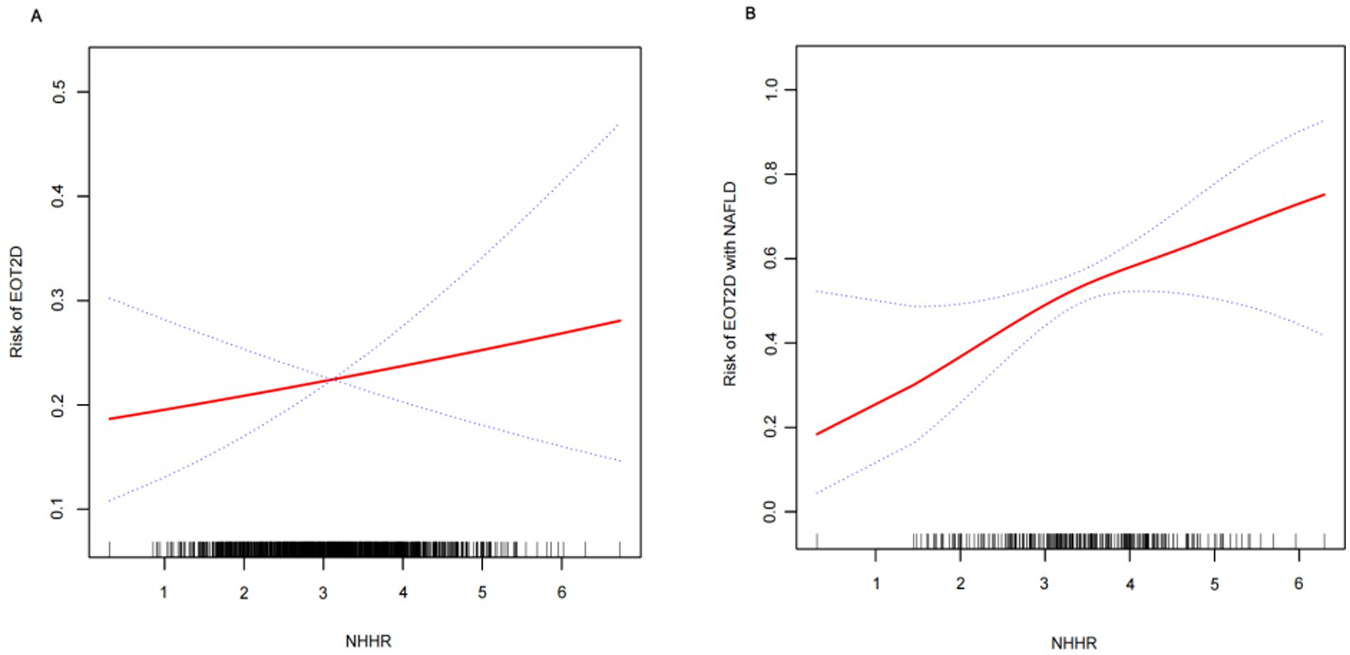 Figure 2. Smooth curve fitting depicting the association between NHHR and EOT2D, as well as EOT2D complicated by NAFLD.