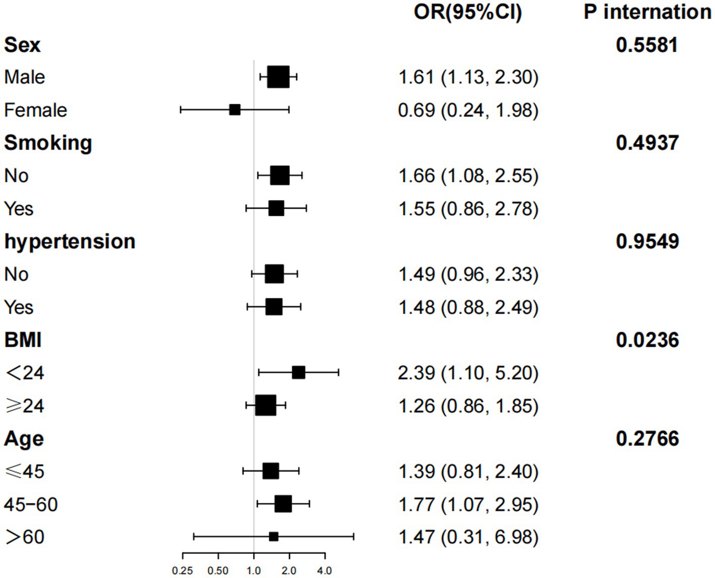 Further subgroup analyses and interaction tests, stratified by age, gender, smoking status, hypertension, and BMI, were conducted to assess the robustness of the association between NHHR levels and the risk of NAFLD combined with EOT2D across different subpopulations. Significant associations were observed among participants with a BMI < 24 kg/m2 (OR: 2.39; 95% CI: 1.10–5.23). Interaction analyses revealed no significant effect modification by gender, age, BMI smoking status, or hypertension on the positive association between NHHR and NAFLD with EOT2D (P-interaction>0.01 for all) (see Figure 3).