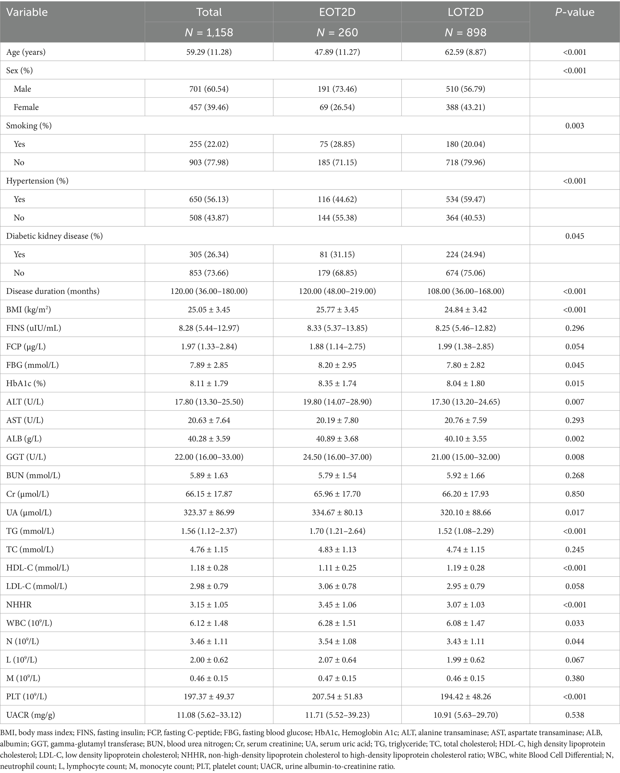 Of the 1,158 participants with T2DM, 260 were in the EOT2D group and 898 in the LOT2D group. 73.46% (191/260) of the EOT2D group and 56.79% (510/898) of the LOT2D group were male. Compared with the patients in the LOT2D group, the duration of diabetes, NHHR, the proportion of smokers, the prevalence of diabetic nephropathy, BMI, FBG, HbA1c, ALT, ALB, GGT, UA, TG, WBC, N, and PLT levels were significantly higher in the EOT2D group (P < 0.05), and HDL-C was lower than in the LOT2D group (P < 0.05) (Table 1). The levels of FINS, AST, BUN, Cr, TC, LDL-C, and UACR were not significantly different between the two groups of participants. Supplementary Table S1 describes the baseline characteristics of the subjects based on NHHR quartiles, and significant differences were observed between NHHR quartiles and baseline characteristics. Individuals in the higher quartile group had a higher prevalence of NAFLD and EOT2D compared with the Q1 group.