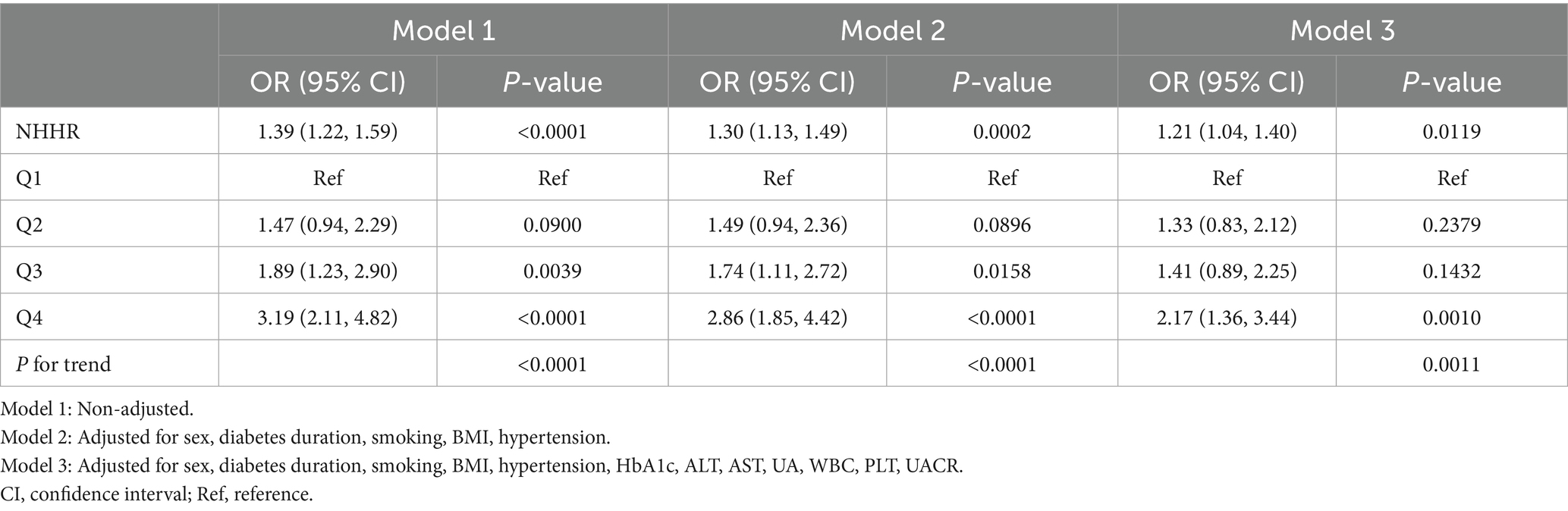 Patients with EOT2D were categorized into two groups according to the presence or absence of comorbid NAFLD and the baseline characteristics of the participants were compared. There were 124 patients in the EOT2D uncomplicated NAFLD group, 71.77% of males and 28.23% of females, who had NHHR values of 3.14 ± 0.91. There were 136 patients in the EOT2D complicated NAFLD group, 75% of males and 25% of females, who had an NHHR value was 3.74 ± 1.11. Compared with the patients in the EOT2D-uncombined NAFLD group, the EOT2D-combined NAFLD group had significantly higher levels of BMI, FINS, FCP, FBG, HbA1c, ALT, AST, ALB, GGT, UA, TG, TC, NHHR, WBC, N, L, M, and PLT (P < 0.05) (see Table 3). Supplementary Table S2 describes the baseline characteristics of EOT2D patients based on NHHR quartiles, and significant differences in NHHR quartiles and baseline characteristics were observed. The prevalence of NAFLD was higher in the higher quartile group of EOT2D patients compared with the Q1 group (see Table 3).