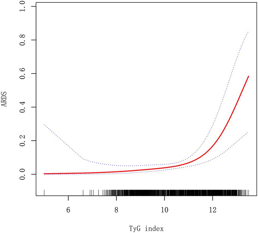 Figure 2. A smooth fitting curve shows the relationship between TyG index and ARDS in AP patients. ARDS, acute respiratory distress syndrome.
