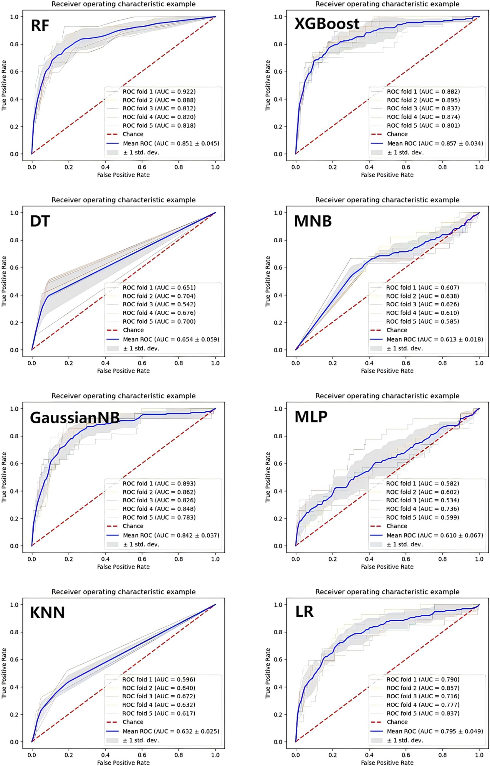 Figure 4. The ROC curves of the machine learning prediction model. XGBoost, eXtreme Gradient Boosting; LR, Logistic Regression; DT, Decision Tree; KNN, K-Nearest Neighbors; GaussianNB, Gaussian Naive Bayes; MultinomialNB, Multinomial Naive Bayes; MLP, Multilayer perceptron; RF, Random Forest.