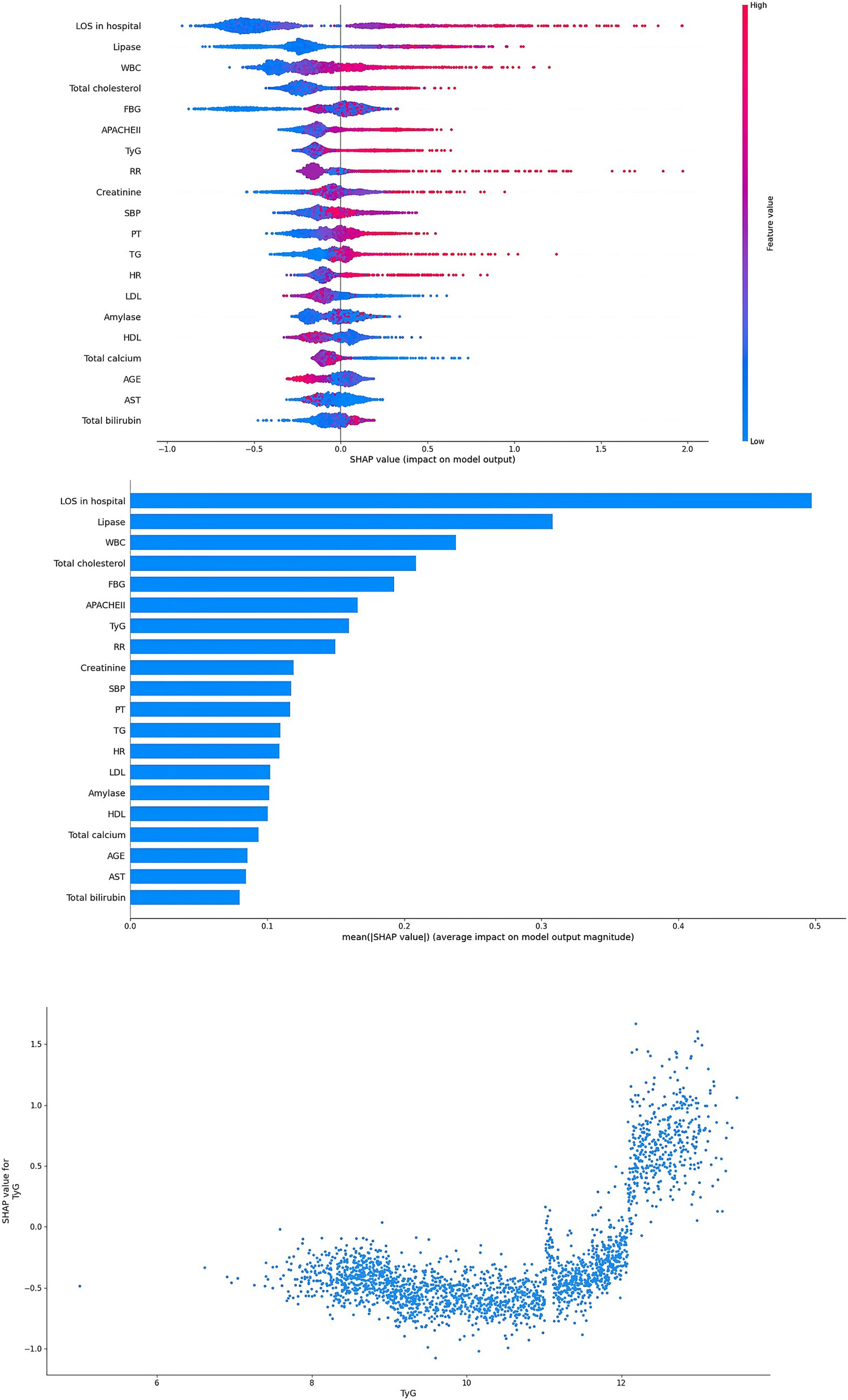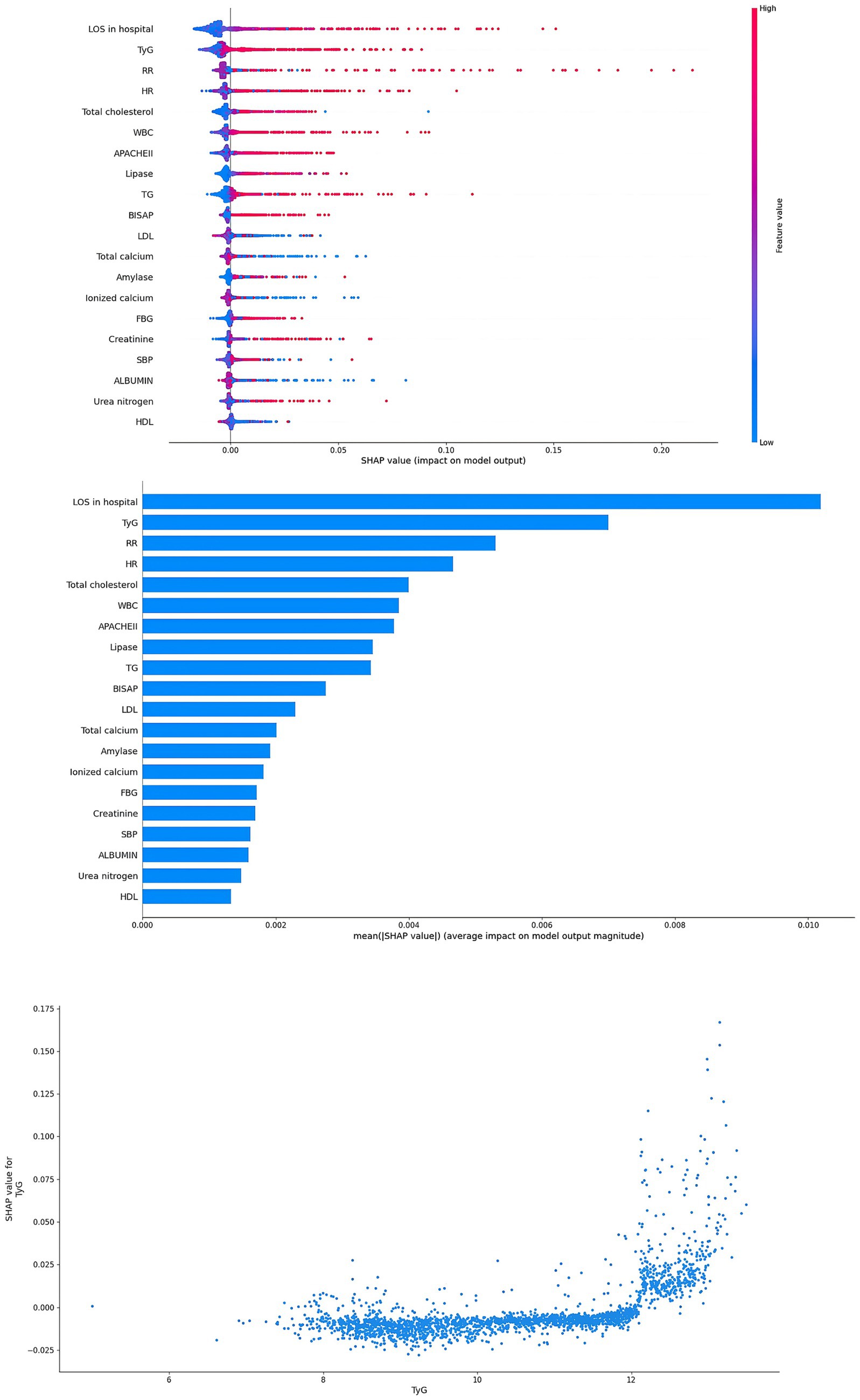 Figure 6. Interpretability for the XGBoost model. Abbreviations: TyG index, triglyceride glucose index; SBP, systolic blood pressure; HR, heart rate; RR, respiratory rate; TG, triglyceride; FBG, fasting blood glucose; WBC, white blood cells; PLT, platelet; PT, prothrombin time; AST, aspartate aminotransferase; LDL, low density lipoprotein; LOS, length of stay; APACHE, acute physiology and chronic health evaluation.