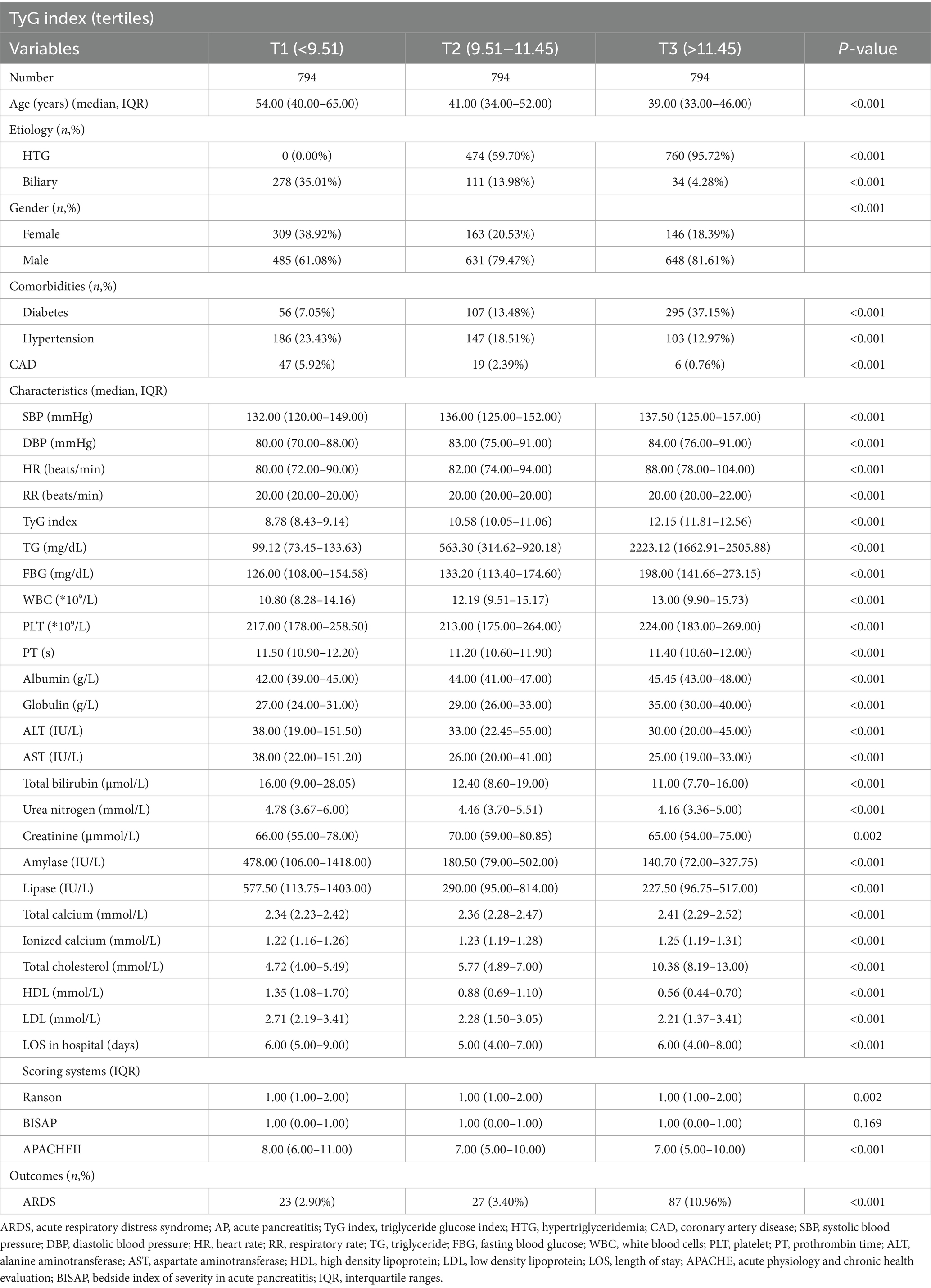 Table 2. Comparison of baseline characteristics between three groups based on tertiles of TyG index in AP patients.