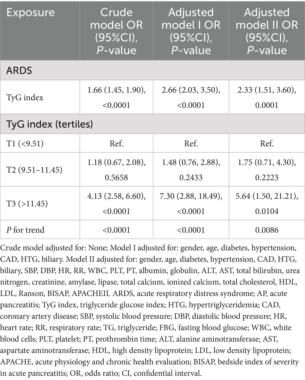 Associations between the TyG index and ARDS in AP patients in different models