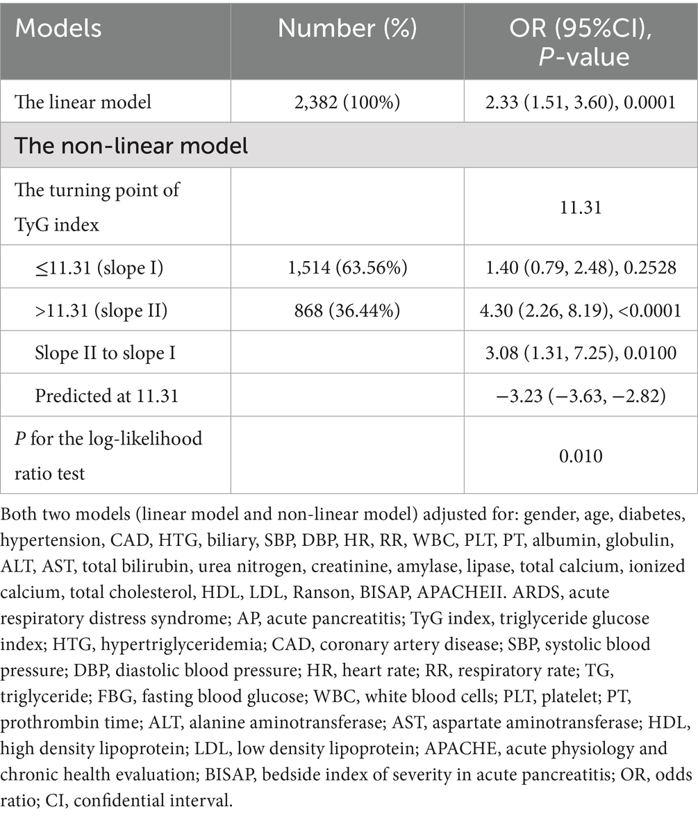Table 5. The linear and non-linear models for the relationship between TyG index and ARDS in AP patients.