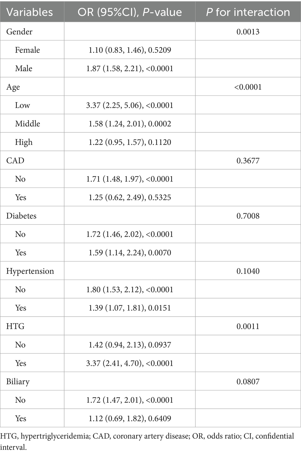 In Table 6, subgroup analysis is shown. In AP with men (OR = 1.87, 95%CI: 1.58–2.21, p < 0.0001), low age (OR = 3.37, 95%CI: 2.25–5.06, p < 0.0001) and HTG (OR = 3.37, 95%CI: 2.41–4.70, p < 0.0001) had a higher risk of ARDS.